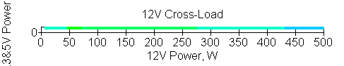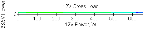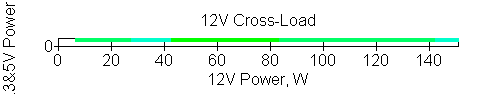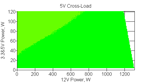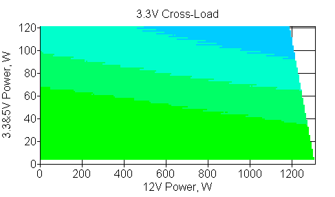 Следующим этапом инструментального тестирования является построение кросснагрузочной характеристики (КНХ) и представление ее на четвертьплоскости, ограниченной максимальной мощностью по шине 3,3&5 В с одной стороны (по оси ординат) и максимальной мощностью по шине 12 В с другой (по оси абсцисс). В каждой точке измеренное значение напряжения обозначается цветовым маркером в зависимости от отклонения от номинального значения.