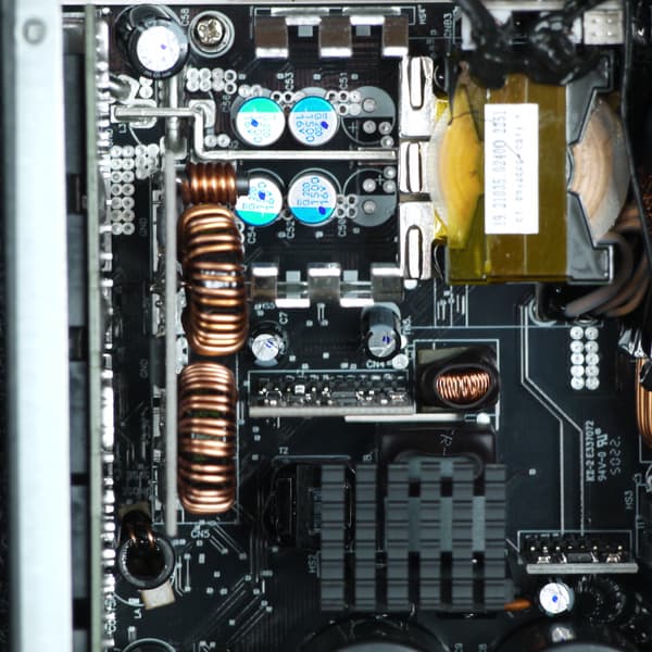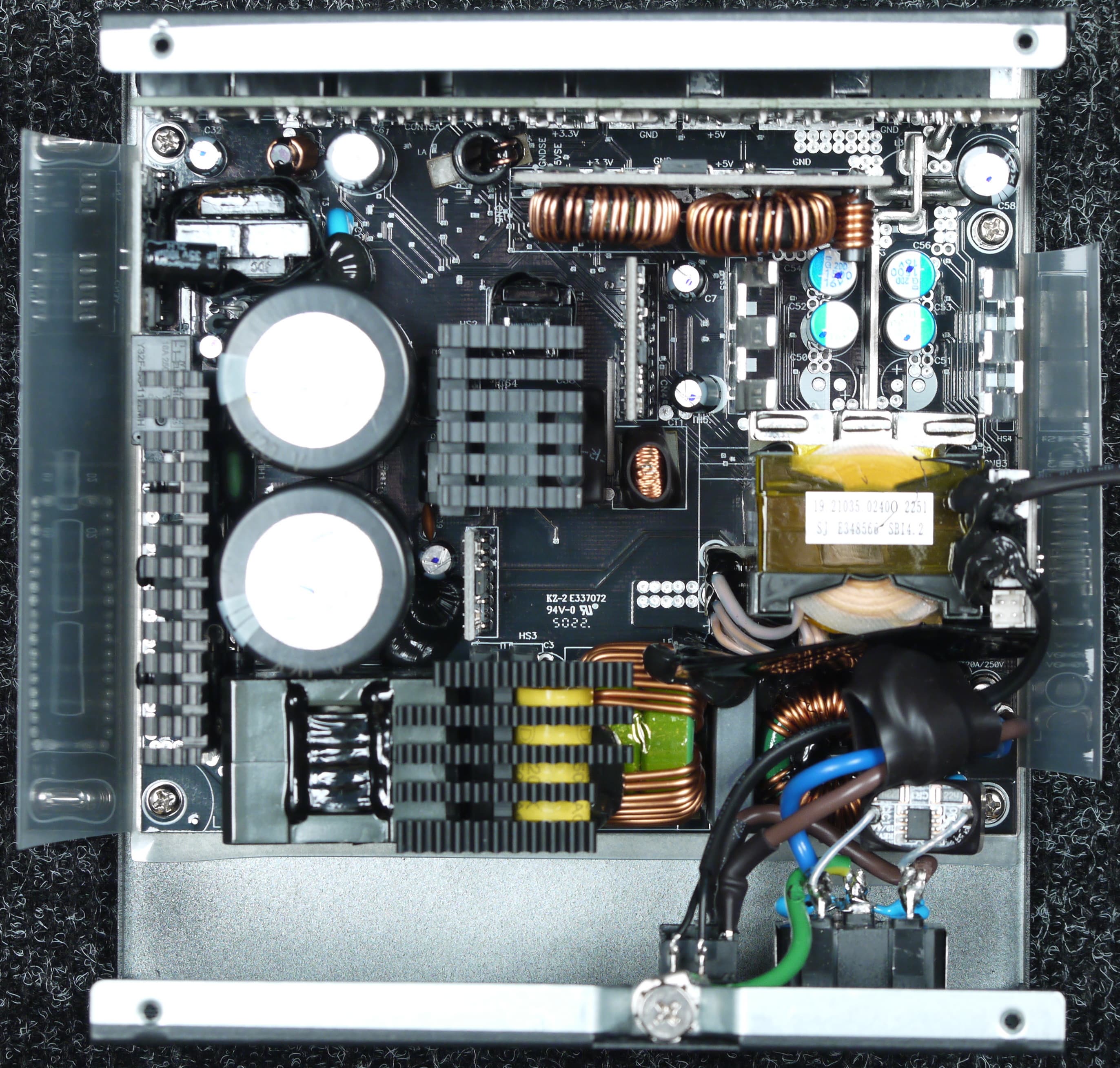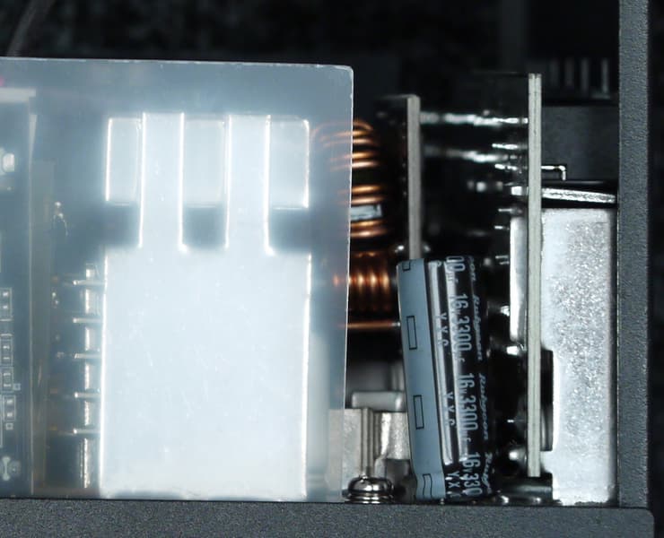 Конструкция блока питания вполне соответствует современным тенденциям: активный корректор коэффициента мощности, синхронный выпрямитель для канала +12VDC, независимые импульсные преобразователи постоянного тока для линий +3.3VDC и +5VDC.