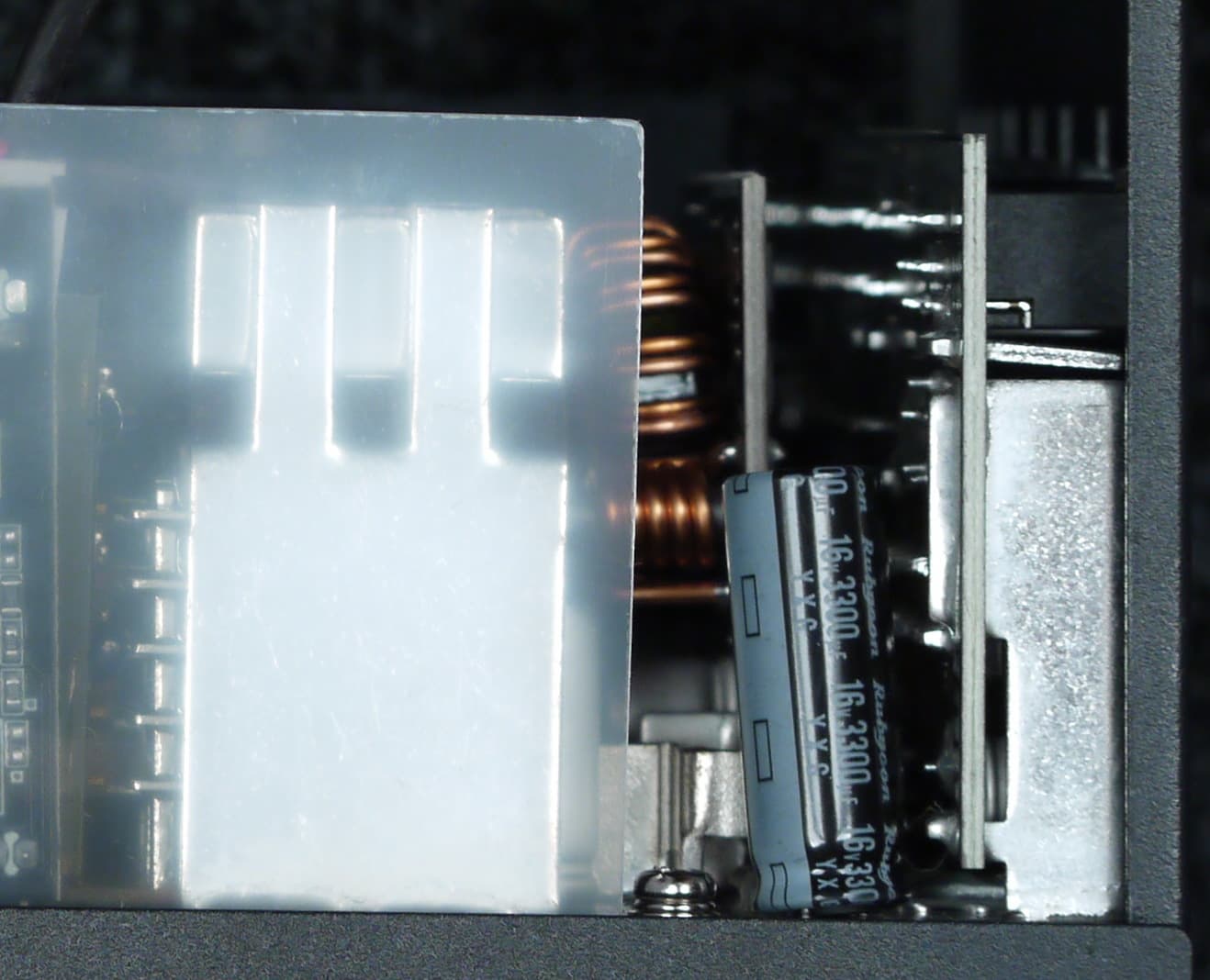 Полупроводниковые элементы высоковольтных цепей размещены на двух радиаторах, входной выпрямитель расположен на отдельном теплоотводе. Элементы синхронного выпрямителя установлены с оборотной стороны основной печатной платы, с лицевой стороны платы над ними имеется теплоотвод. Трансформатор также снабжен собственным радиатором.
