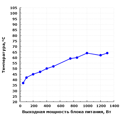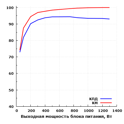 Всего таким образом мы измерили параметры блока питания в 11 точках. В результате максимальный КПД в нашем случае составил 94,4% при выходной мощности 750 Вт. Максимальная рассеиваемая мощность составила 97 Вт при выходной мощности 1300 Вт, что совсем немного для блока питания подобной мощности.