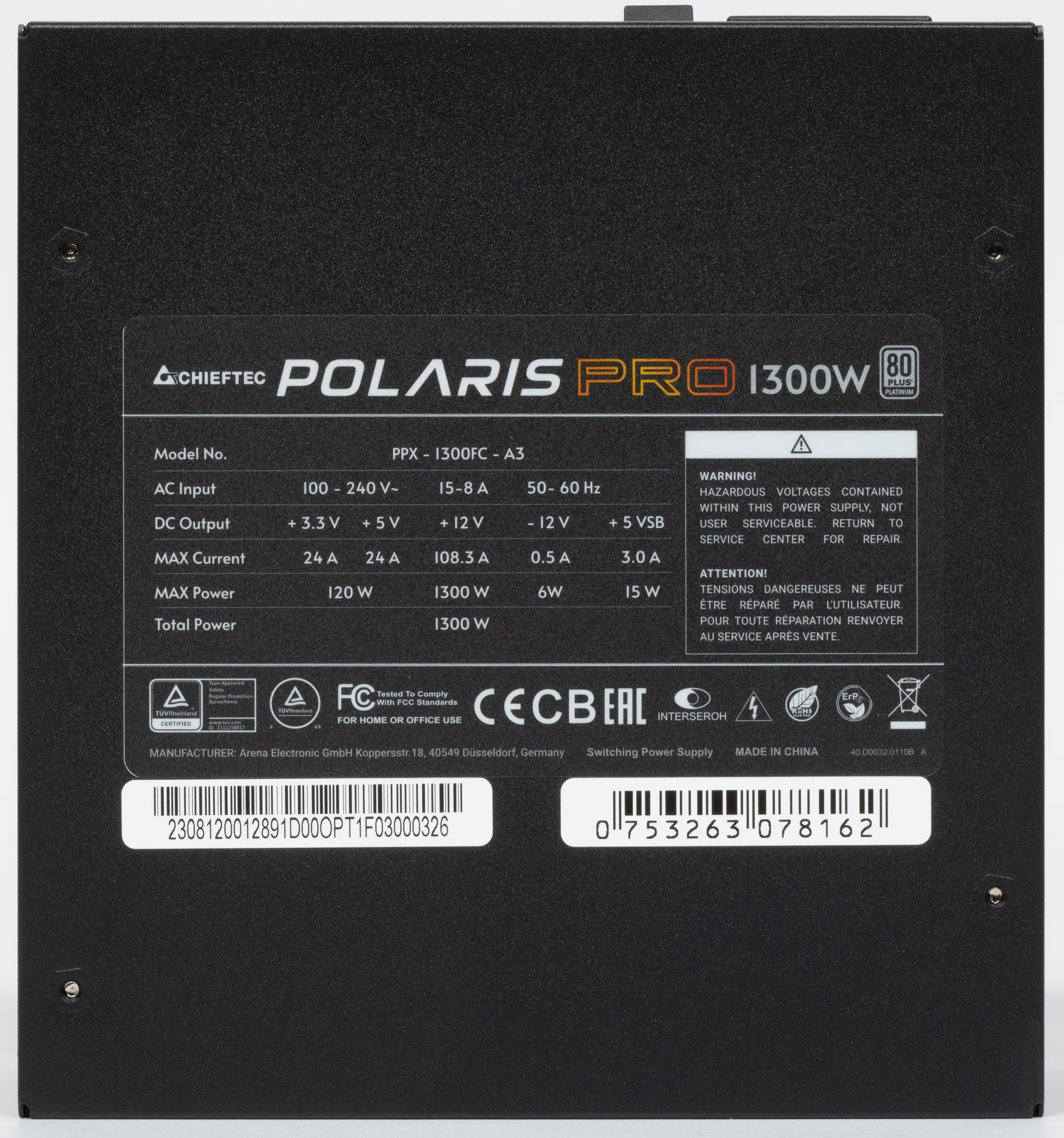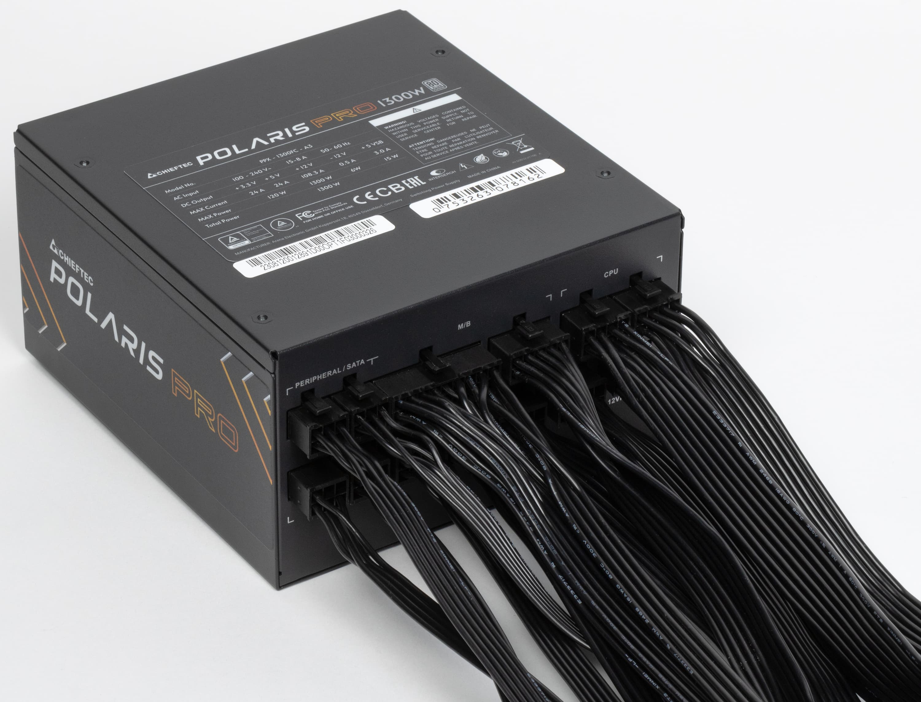 Блок питания Chieftec Polaris Pro 1300W (PPX-1300FC-A3), согласно официальным данным, имеет сертификат 80+ Platinum и укомплектован исключительно японскими конденсаторами. Стоимость этой модели на момент публикации обзора составляла около 20 тысяч рублей.
