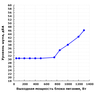 При работе с постоянно вращающимся вентилятором в диапазоне мощности до 500 Вт включительно шум блока питания находится на пониженном уровне для жилого помещения в дневное время суток — около 30 дБА с расстояния 0,35 метра.