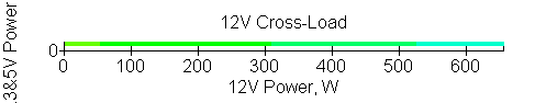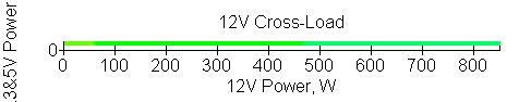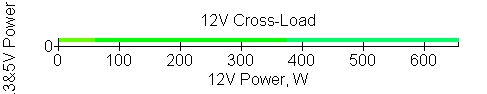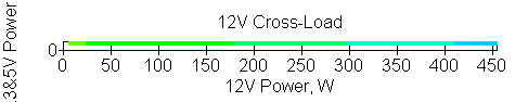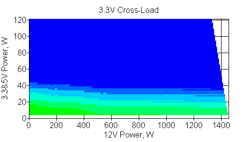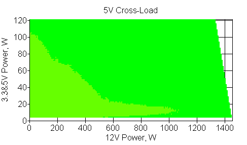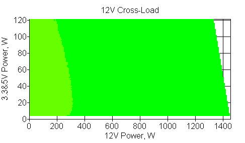 Следующим этапом инструментального тестирования является построение кросснагрузочной характеристики (КНХ) и представление ее на четвертьплоскости, ограниченной максимальной мощностью по шине 3,3&5 В с одной стороны (по оси ординат) и максимальной мощностью по шине 12 В с другой (по оси абсцисс). В каждой точке измеренное значение напряжения обозначается цветовым маркером в зависимости от отклонения от номинального значения.