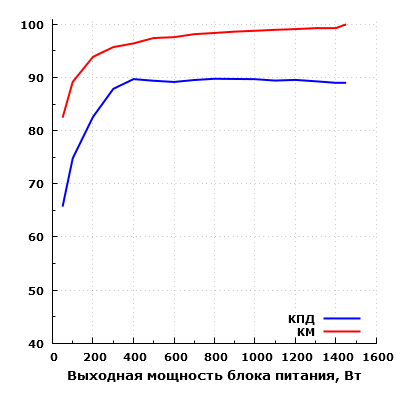 Эффективность БП находится на среднем уровне. Согласно нашим измерениям, КПД данного блока питания достигает значения свыше 89% в диапазоне мощности от 400 до 1450 ватт, максимальное зарегистрированное значение составило 89,8% на мощности 800 Вт. Одновременно с этим, КПД на мощности 50 Вт составил 65,7%.