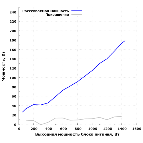 Экономичность модели находится на вполне адекватном уровне: на максимальной мощности БП рассеивает около 180 Вт, 60 Вт он рассеивает на мощности порядка 500 Вт, 100 Вт — на мощности около 900 Вт. Показатели не самые выдающие, но и далеко не самые худшие. На мощности 50 Вт блок питания рассеивает около 26,1 Вт.
