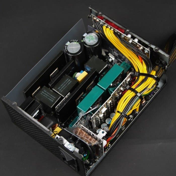 Элементы корректора коэффициента мощности и основного инвертора размещены на вполне стандартных радиаторах, представляющих собой пластины. Толщина основания радиаторов составляет около 6 мм. Элементы синхронного выпрямителя располагаются на дочерних платах, установленных вертикально. Импульсные источники питания на основе преобразователей постоянного тока напряжений +3.3VDC и +5VDC располагаются на плате с выходными разъемами, что несколько затруднит теплоотвод от данного узла.