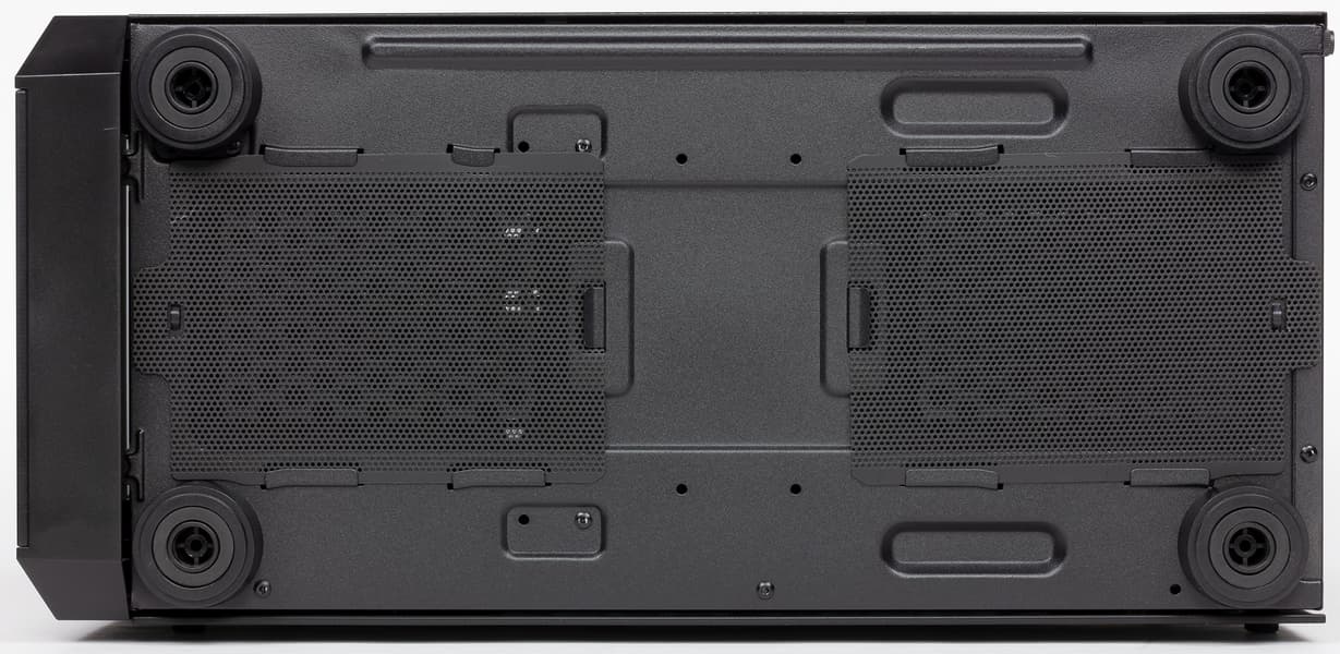 На днище шасси есть отверстия в месте расположения блока питания, размер перфорированной области вполне достаточный для БП длиной 140-180 мм. Боковые стенки (и левая стеклянная, и правая металлическая) сплошные, размещение вентиляторов на них невозможно.