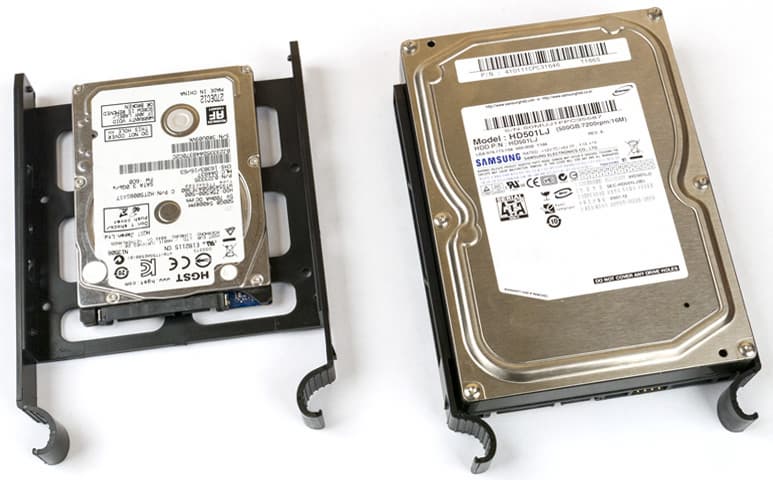 3,5-дюймовые накопители в них фиксируются пластиковыми выступами, входящими в боковые отверстия корпуса диска, возможна дополнительная фиксация винтами, четырьмя снизу или двумя по бокам; каких-либо амортизаторов нет. 2,5-дюймовые SSD/HDD крепятся четырьмя винтами снизу.