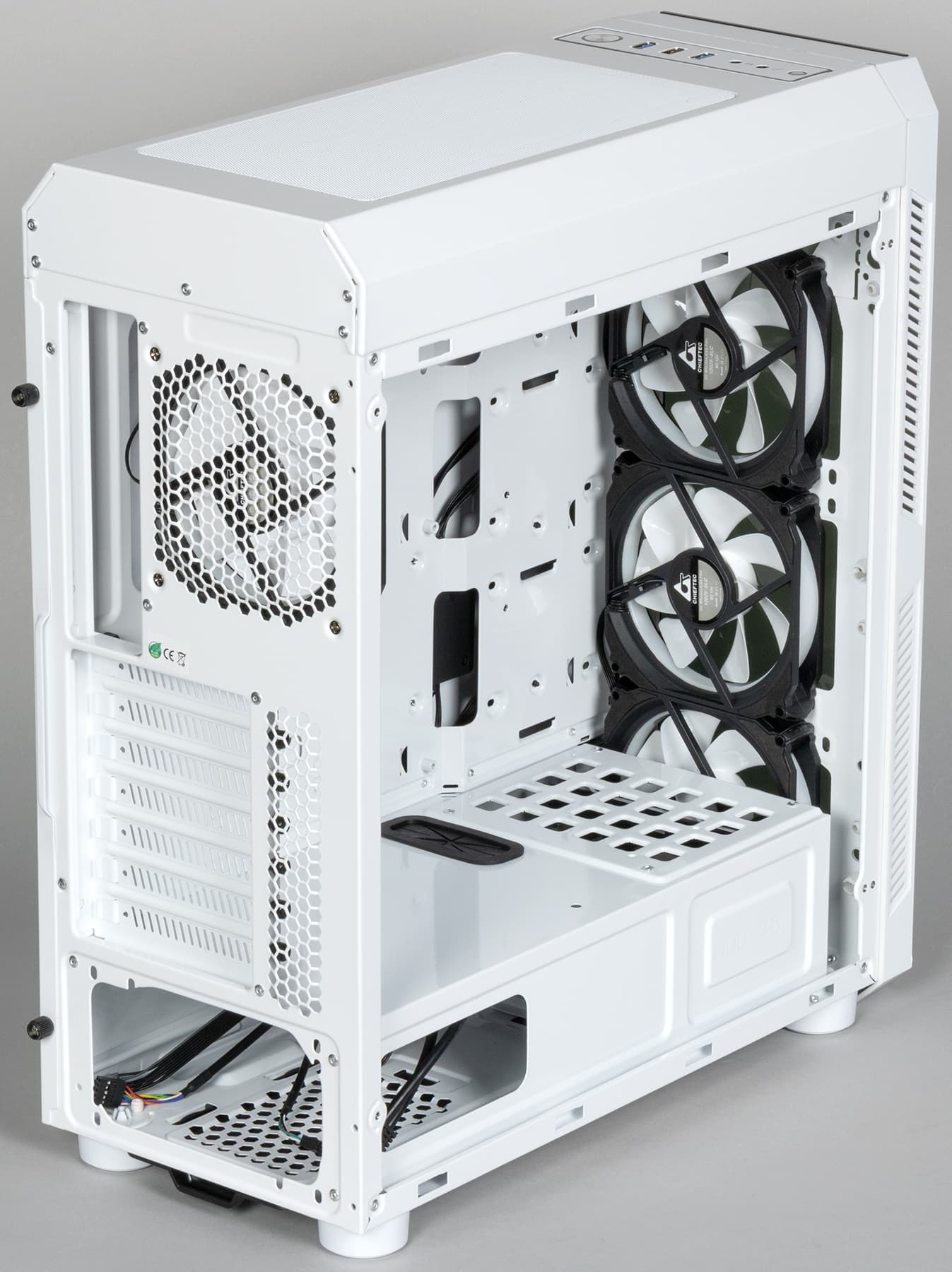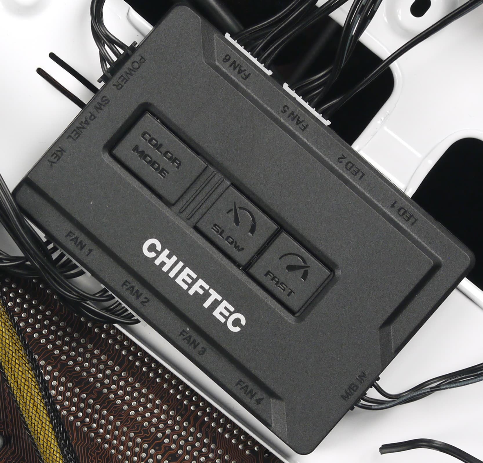 У данной модели корпуса две стеклянные панели: спереди и слева. Предустановлены вентиляторы с ARGB-подсветкой и штатный контроллер управления вентиляторами с ПДУ.