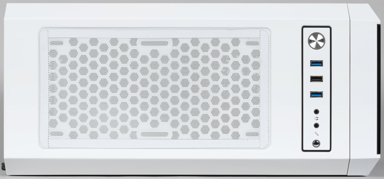В передней части верхней панели размещены органы управления и коммутации. В их состав входят: три разнесенных друг от друга примерно на 12 мм порта USB (один USB 2.0 и два USB 3.0), стандартные разъемы для подключения микрофона и наушников, большая круглая кнопка включения и кнопка перезагрузки. Кнопки располагаются с разных сторон панели и отличаются размерами.