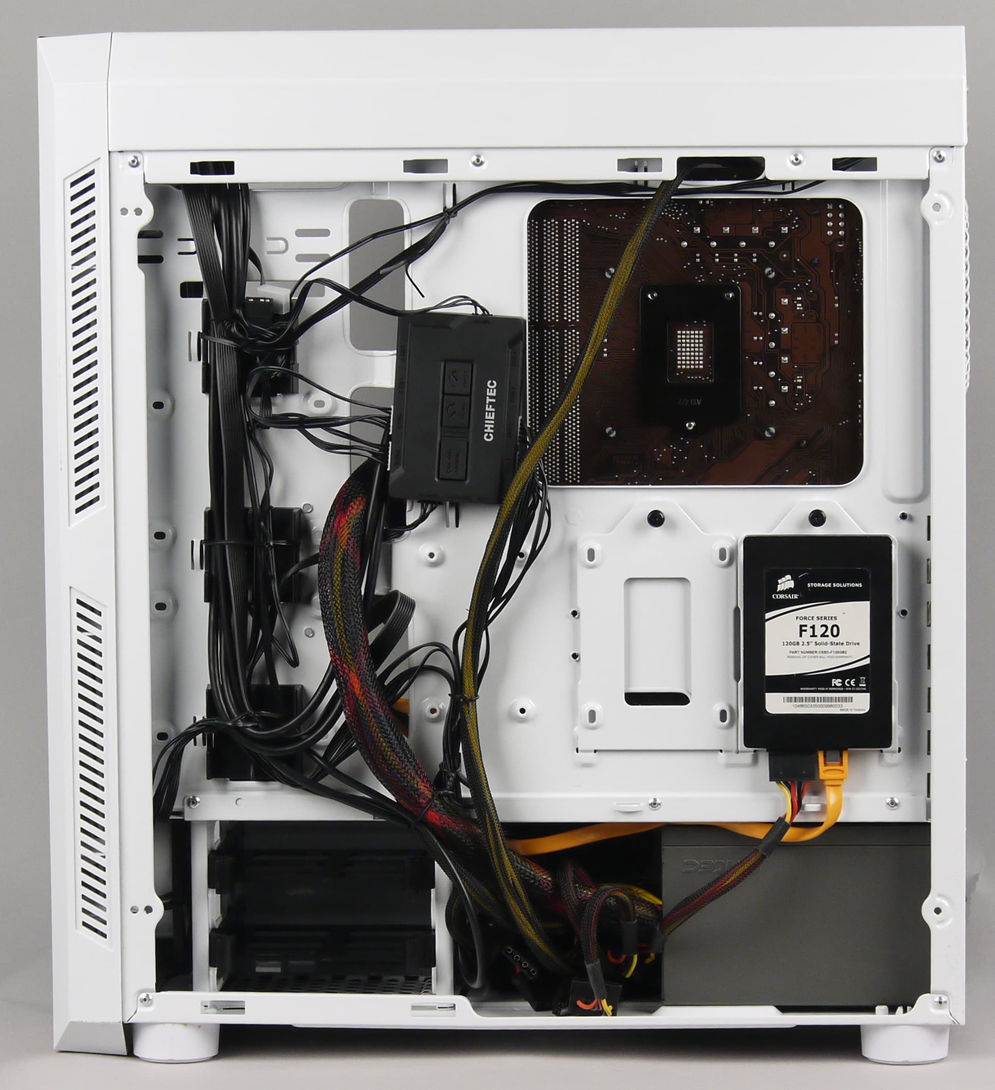 Глубина отсека для прокладки проводов составляет около 18 мм у задней стенки. Это не так уж и много, поэтому блок питания лучше предпочесть с ленточными проводами.
