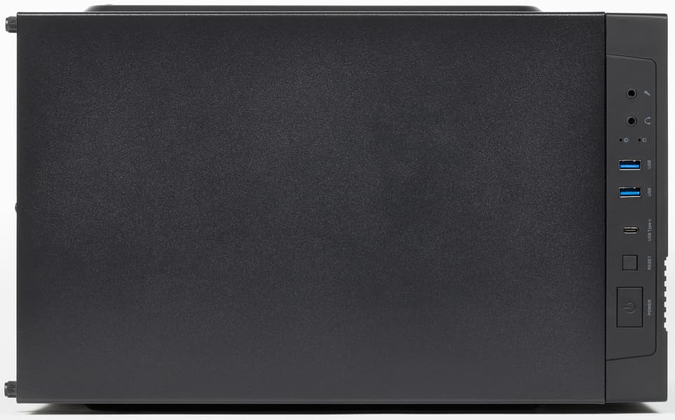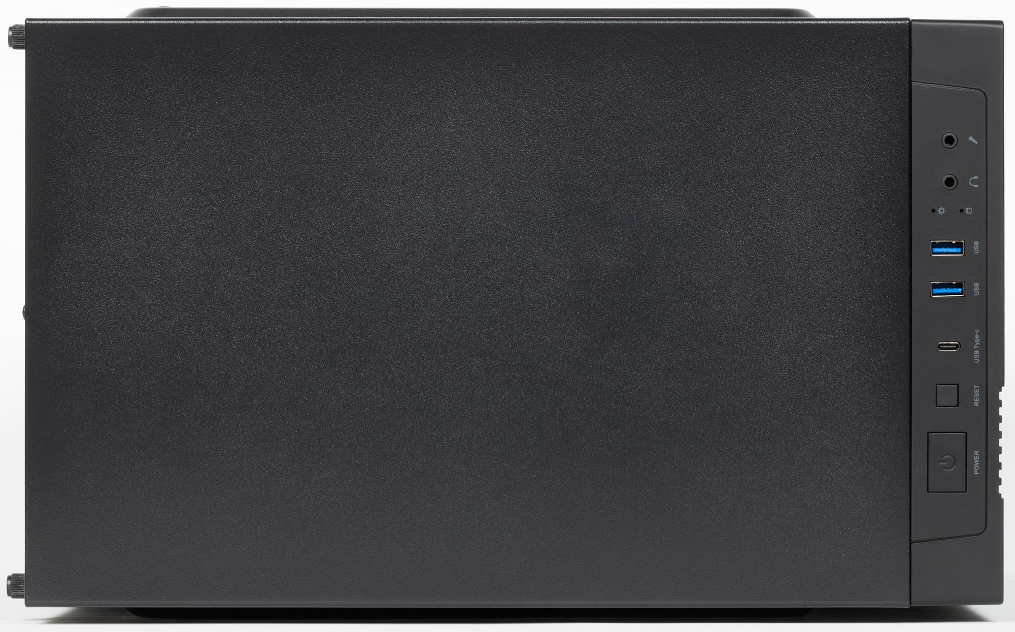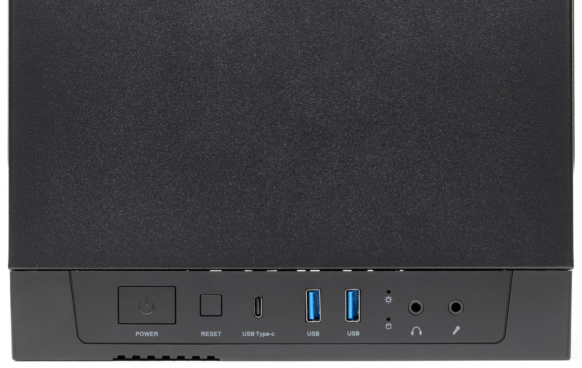 В передней части верхней панели размещены органы управления и коммутации. В их состав входят: два порта USB 3.0, один порт USB 3.1 Gen2 (USB 3.1) Type-C, стандартные разъемы для подключения микрофона и наушников, большая прямоугольная кнопка включения и маленькая квадратная кнопка перезагрузки.