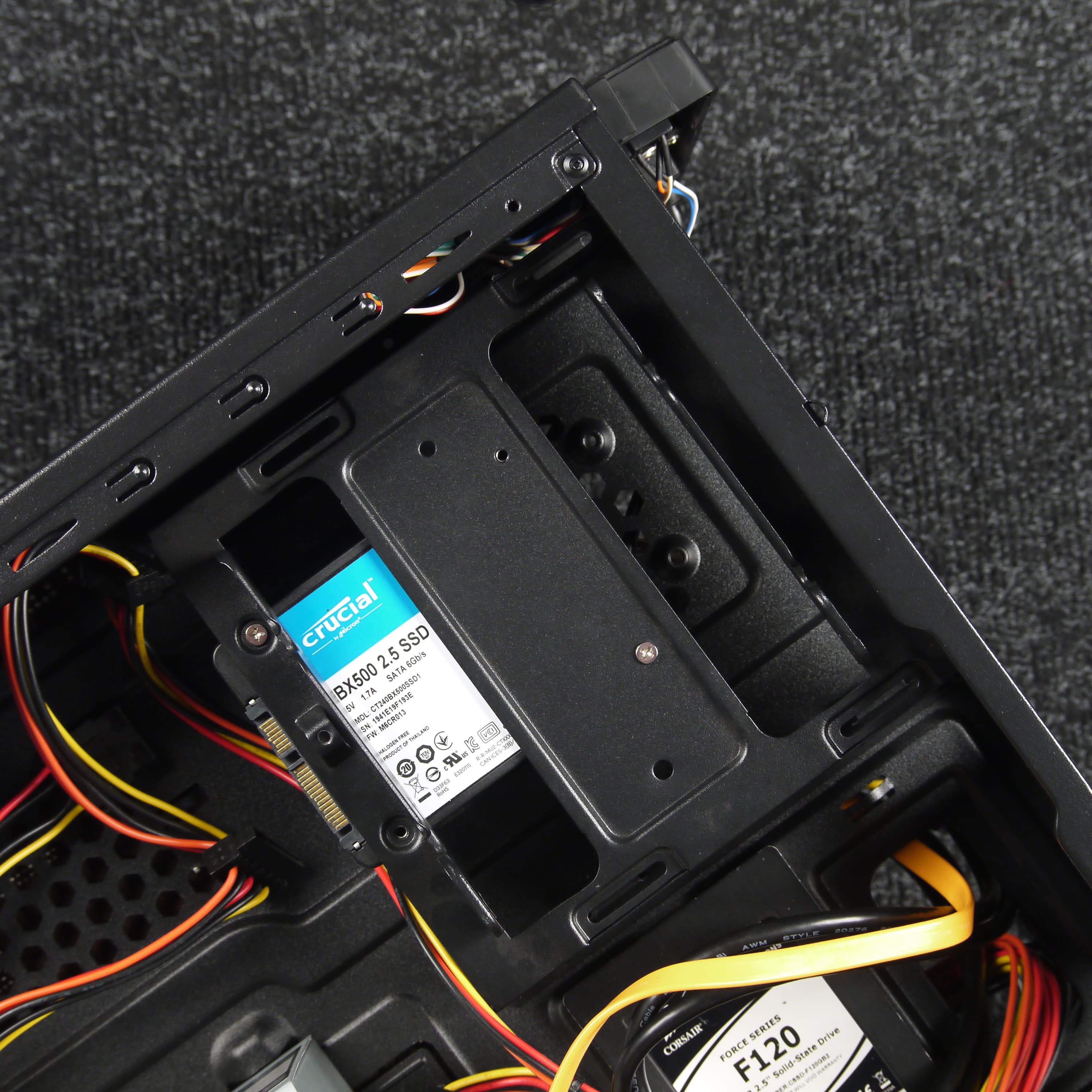 Еще одно посадочное место для накопителя формата 2,5 дюйма расположено в нижней части основания для системной платы около передней панели. Фиксация накопителя осуществляется при помощи винтов, которые нужно закрутить в накопитель со стороны дна сквозь основание для системной платы.