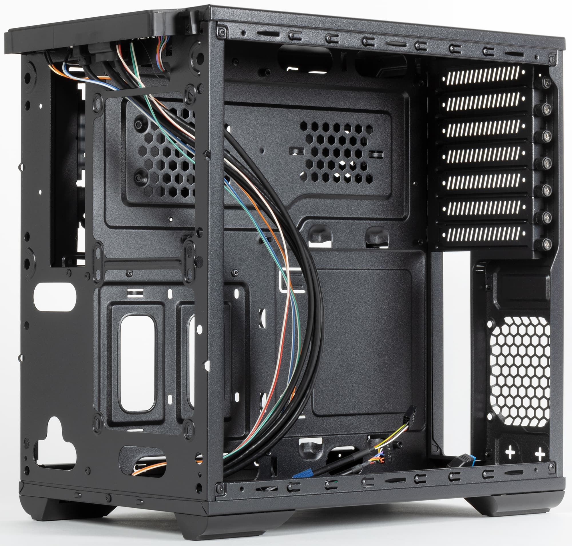 Шасси корпуса используется весьма бюджетное, толщина стенок — 0,5 мм. Заметны усилия, направленные на увеличение жесткости конструкции путем использования деталей специальной формы. Однако в элементах имеются большие отверстия и проемы, так что стали использовано не так много. За счет особенностей конструкции жесткость корпуса на скручивание можно считать если и не высокой, то вполне приличной, особенно в собранном состоянии. Этому сильно способствует основание для системной платы, которое выполняет роль дополнительного элемента жесткости, крепясь со всех четырех сторон к шасси корпуса (с трех сторон оно приклепано), а также относительно небольшие габариты корпуса в целом.