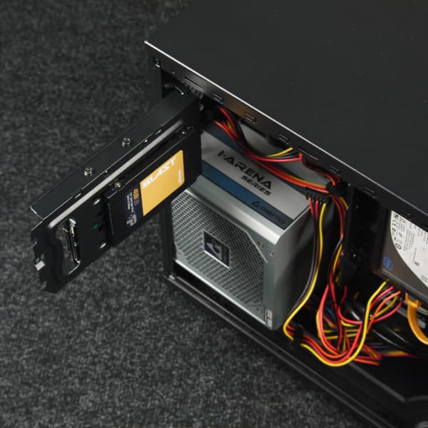 Еще два посадочных места реализованы на поворотном держателе в задней части корпуса. С лицевой стороны на него можно установить накопитель 3,5 или 2,5 дюйма с фиксацией винтами. С оборотной стороны можно установить накопитель формата 2,5 дюйма с фиксацией винтами по бокам.
