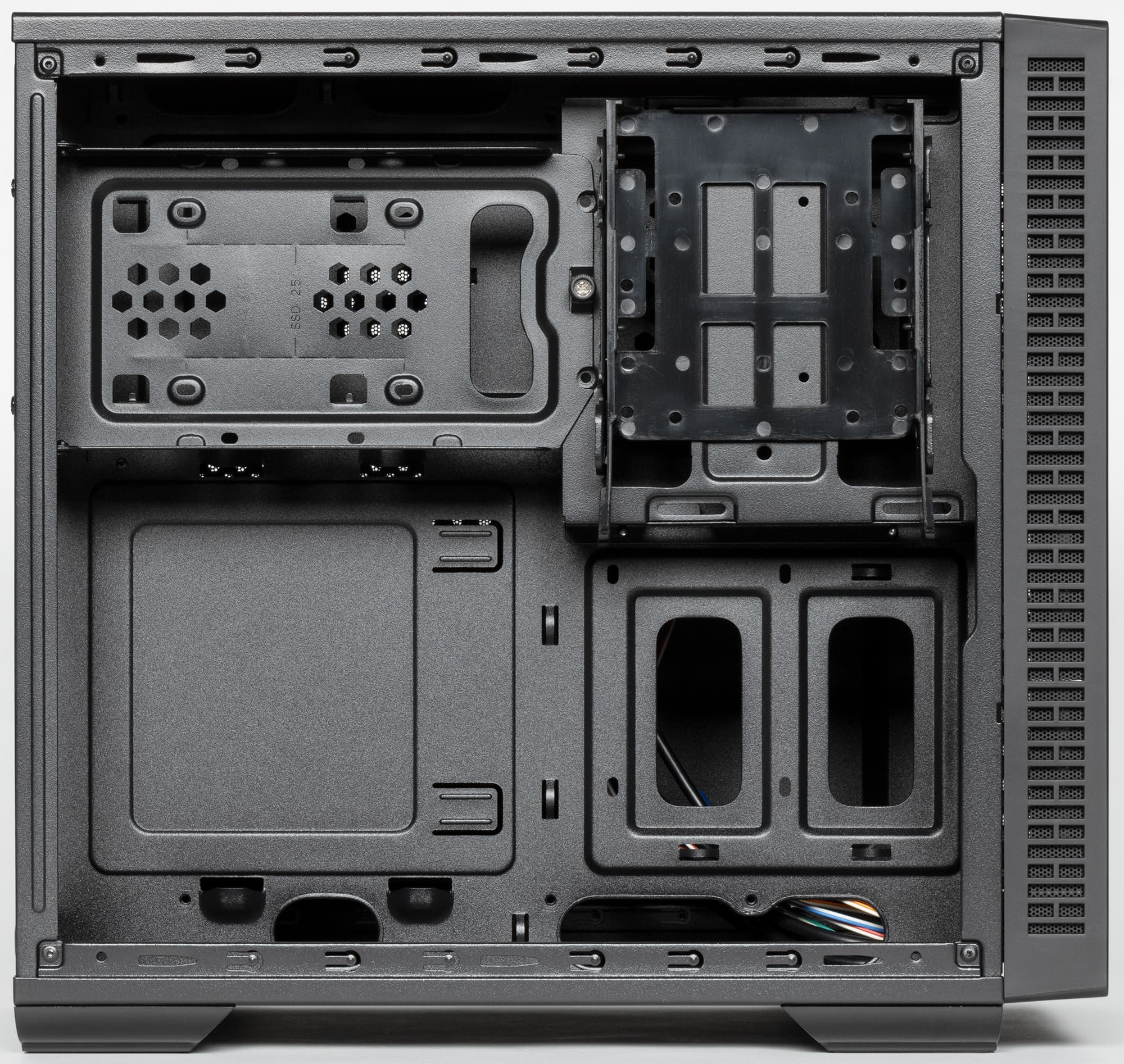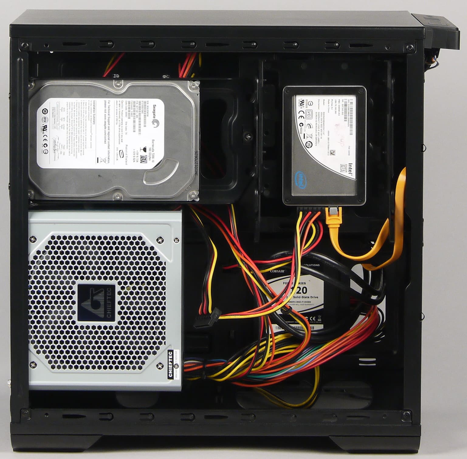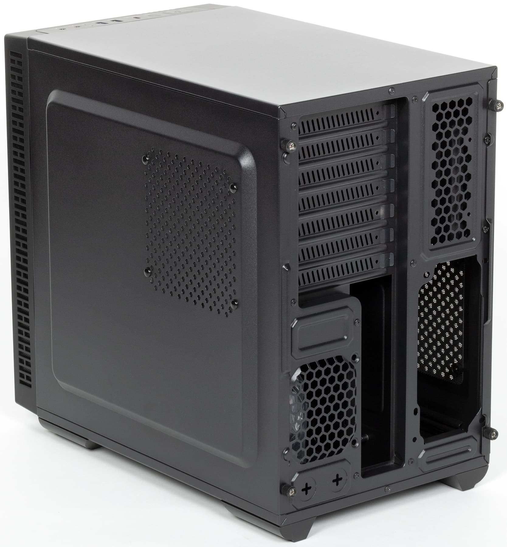 Таким образом, всего в корпус можно установить пять накопителей: 1×5,25″, 2×3,5″ и 2×2,5″ (2,5-дюймовые диски могут быть установлены вместо любого более крупного накопителя). Этого вполне достаточно для большинства современных компьютеров, хотя для рабочей станции может быть маловато.