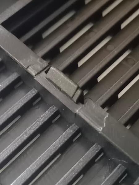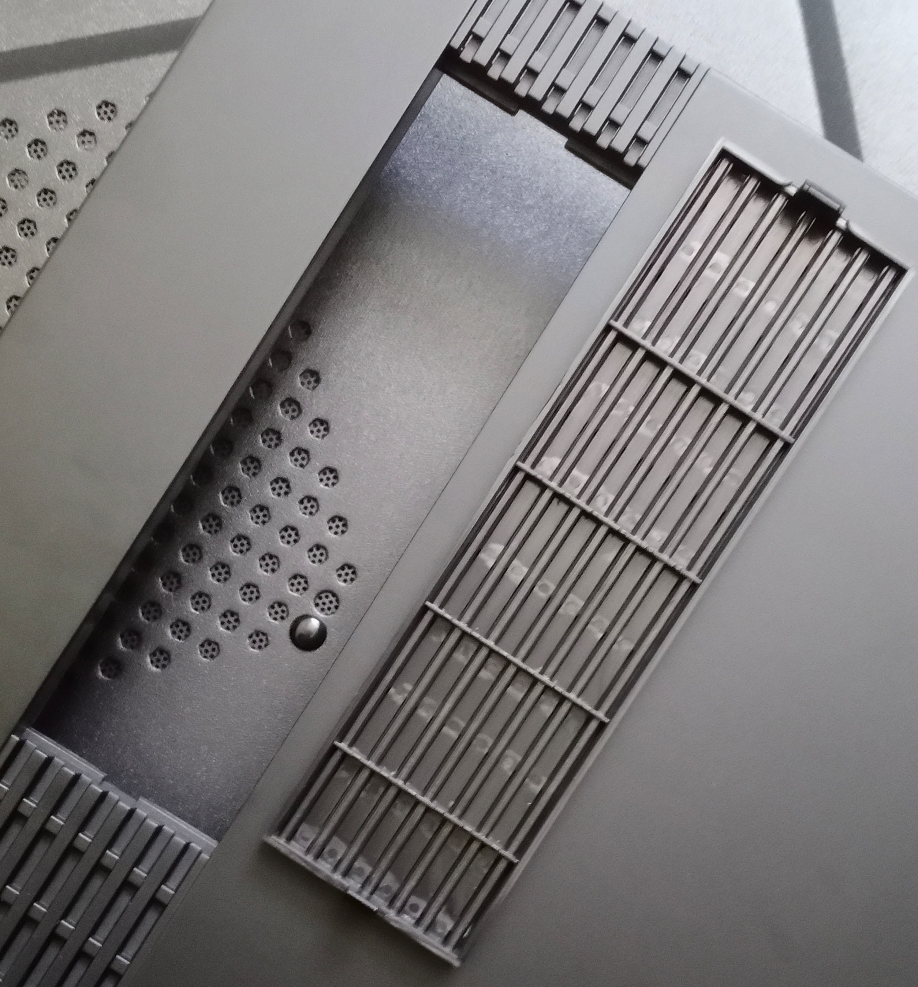 Фильтры на боковых панелях выполнены из крупноячеистой сетки, которая представляет собой проштампованный лист пластика с круглыми отверстиями. Рамок они не имеют, снять их нельзя, что не очень удобно.