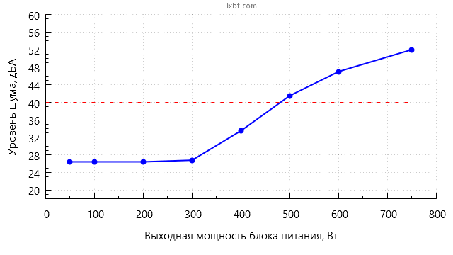 В диапазоне мощности до 300 Вт включительно шум блока питания находится на пониженном уровне для жилого помещения в дневное время суток — около 27 дБА с расстояния 0,35 метра.