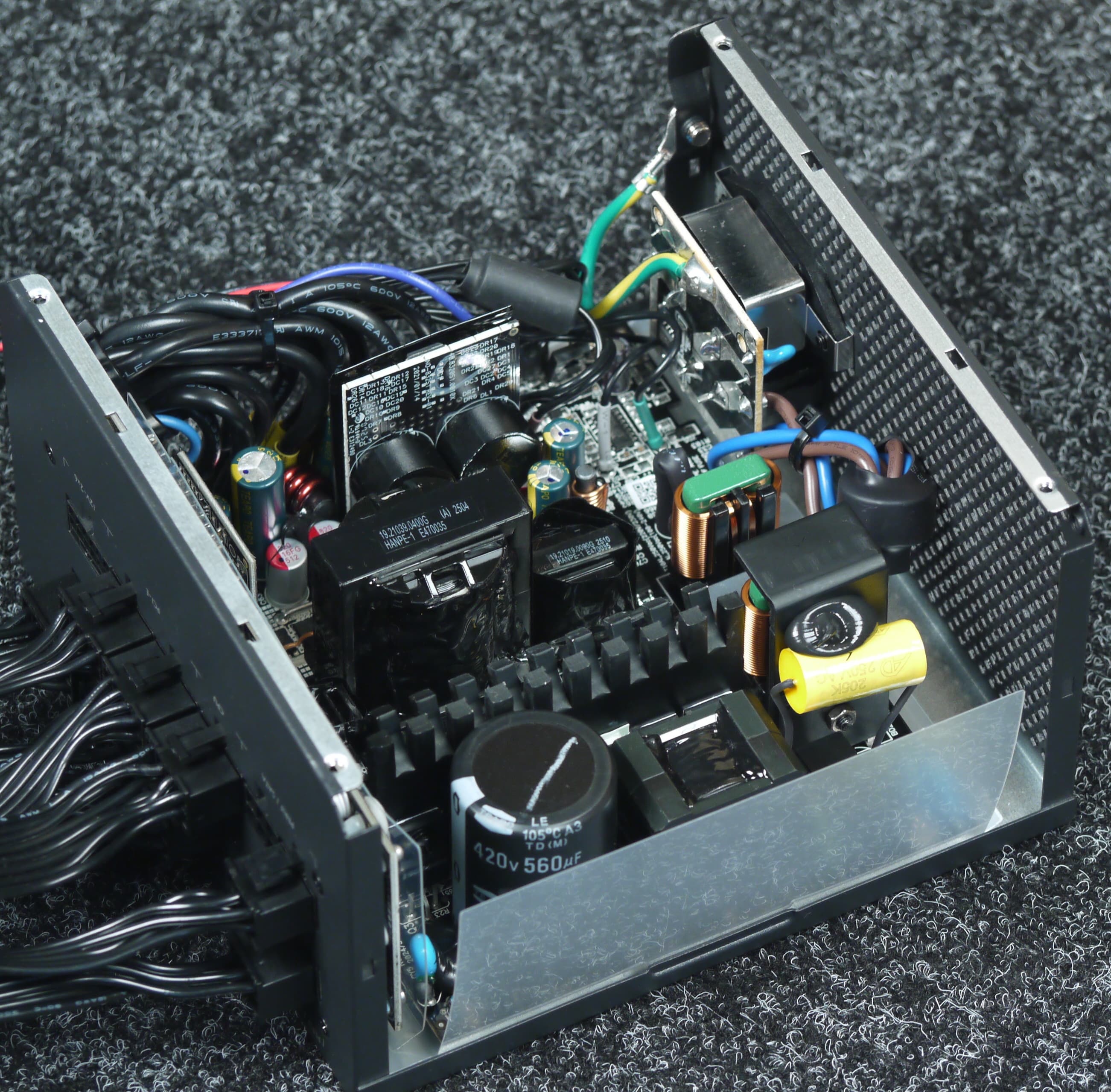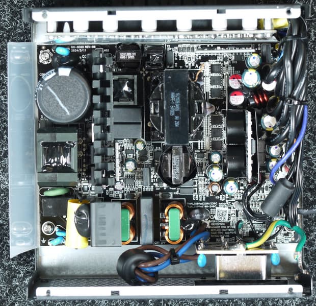 Конструкция блока питания вполне соответствует современным тенденциям: активный корректор коэффициента мощности, синхронный выпрямитель для канала +12VDC, независимые импульсные преобразователи постоянного тока для линий +3.3VDC и +5VDC.