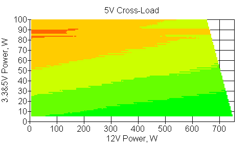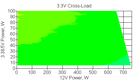 Следующим этапом инструментального тестирования является построение кросснагрузочной характеристики (КНХ) и представление ее на четвертьплоскости, ограниченной максимальной мощностью по шине 3,3&5 В с одной стороны (по оси ординат) и максимальной мощностью по шине 12 В с другой (по оси абсцисс). В каждой точке измеренное значение напряжения обозначается цветовым маркером в зависимости от отклонения от номинального значения.