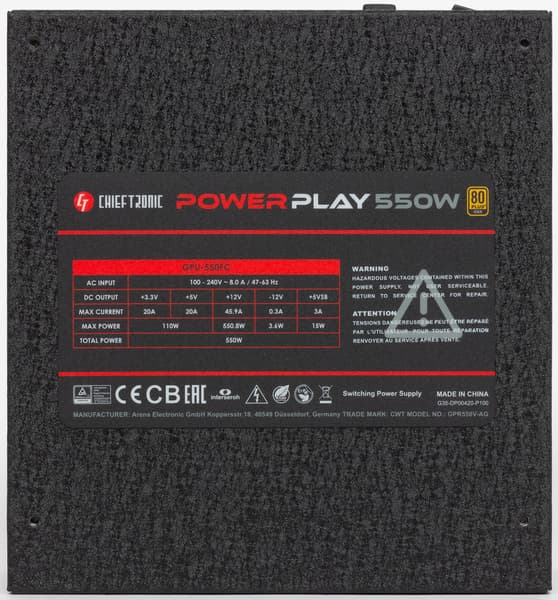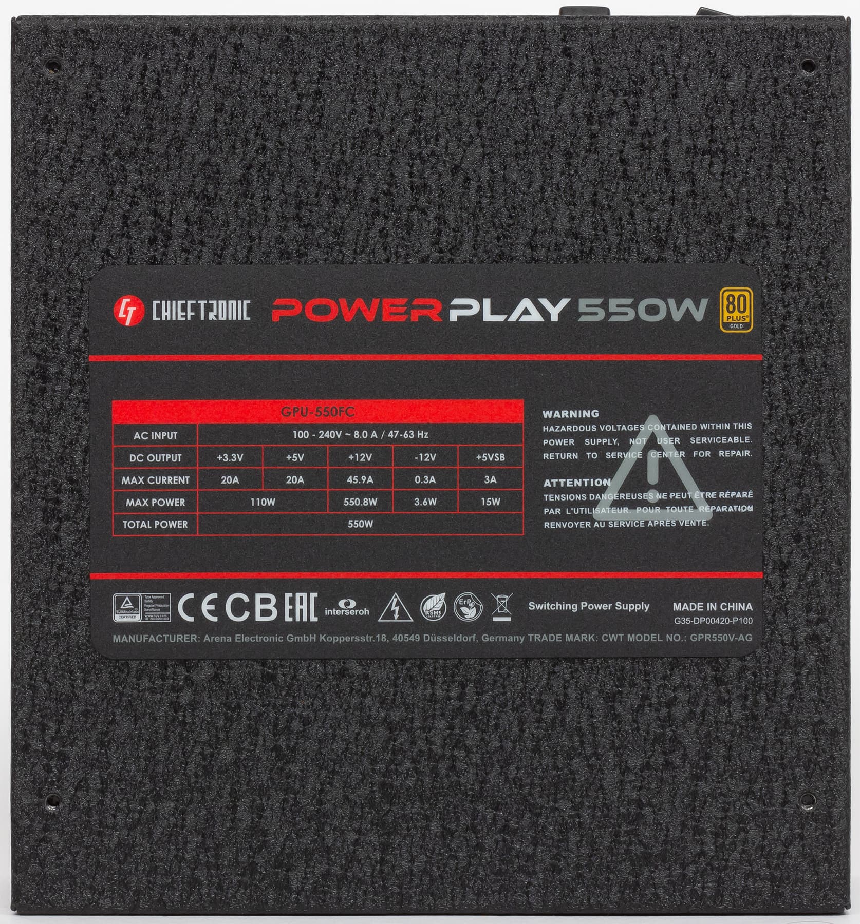 На данный момент под маркой Chieftronic предлагаются корпуса и блоки питания, но не исключено, что ассортимент товаров будет расширен. Блоки питания представлены двумя сериями: PowerPlay Gold и PowerPlay Platinum. В серии PowerPlay Gold предлагаются три модели: мощностью 550, 650 и 750 Вт. Все три источника питания имеют сертификат 80Plus Gold, нам предстоит познакомиться с младшим представителем данной немногочисленной группы — блоком питания Chieftronic PowerPlay 550W (GPU-550FC). В российской рознице на момент подготовки обзора он стоил около 6 тысяч рублей.