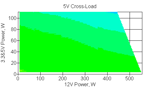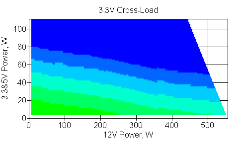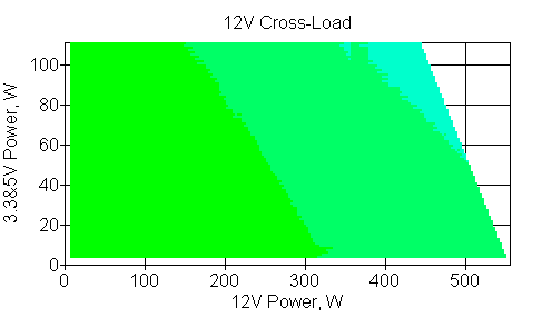 Следующим этапом инструментального тестирования является построение кросснагрузочной характеристики (КНХ) и представление ее на четвертьплоскости, ограниченной максимальной мощностью по шине 3,3&5 В с одной стороны (по оси ординат) и максимальной мощностью по шине 12 В с другой (по оси абсцисс). В каждой точке измеренное значение напряжения обозначается цветовым маркером в зависимости от отклонения от номинального значения.