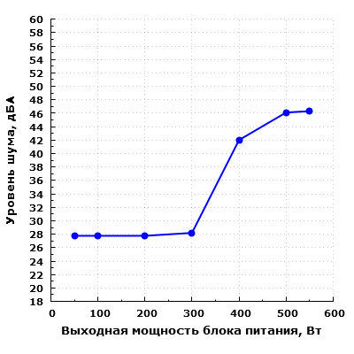 Шум блока питания находится на сравнительно низком уровне (ниже среднетипичного) при работе в диапазоне мощности до 300 Вт включительно. Такой шум будет малозаметен на фоне типичного фонового шума в помещении в дневное время суток, особенно при эксплуатации данного блока питания в системах, не имеющих какой-либо звукошумовой оптимизации. В типичных бытовых условиях большинство пользователей оценивает устройства с подобной акустической эргономикой как относительно тихие.