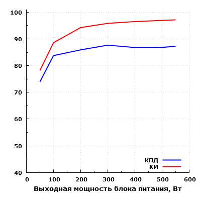 Эффективность БП находится на хорошем уровне. Согласно нашим измерениям, КПД данного блока питания достигает значения свыше 85% в диапазоне мощности от 200 до 550 ватт. Максимальное зарегистрированное значение составило 87,7% на мощности 300 Вт. Одновременно с этим, КПД на мощности 50 Вт составил около 74%.