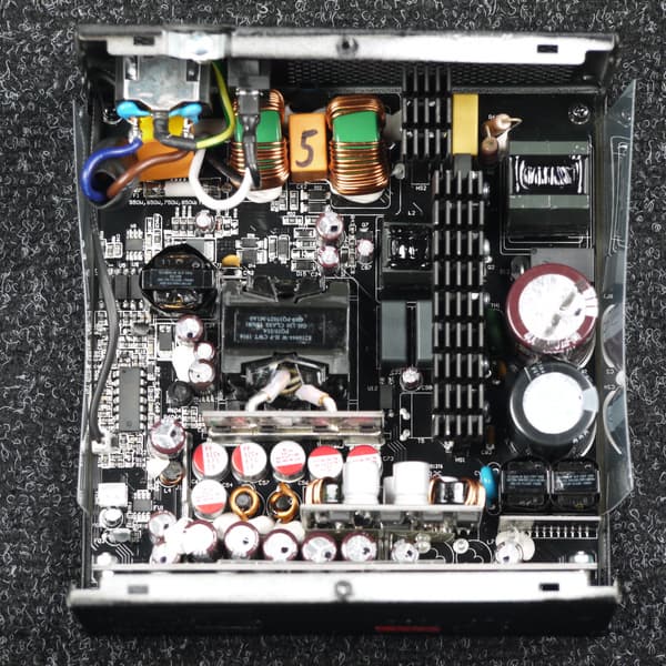 Полупроводниковые элементы высоковольтных цепей размещены на двух радиаторах средних размеров. Элементы синхронного выпрямителя размещены на дочерней плате, там же есть теплорассеивающие элементы в виде тонких пластин. Независимые источники +3.3VDC и 5VDC установлены на дочерней печатной плате и, по традиции, дополнительных теплоотводов не имеют — это вполне типично для блоков питания с активным охлаждением.