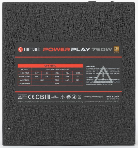 Блоки питания под маркой Chieftronic представлены двумя сериями: PowerPlay Gold и PowerPlay Platinum. В серии PowerPlay Gold предлагаются три модели мощностью 550, 650 и 750 Вт, все они имеют сертификат 80Plus Gold. С младшей моделью мы уже знакомы, теперь нам предстоит познакомиться со старшей — блоком питания Chieftronic PowerPlay 750W (GPU-750FC). В российской рознице на момент публикации обзора он стоил около 7500 рублей.