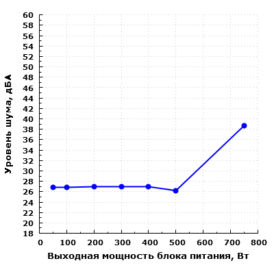 При дальнейшем увеличении выходной мощности уровень шума заметно повышается, и при нагрузке в 750 Вт он приближается к значению 40 дБА при условии настольного размещения, то есть при расположении блока питания в ближнем поле по отношению к пользователю. Подобный уровень шума можно охарактеризовать как повышенный.