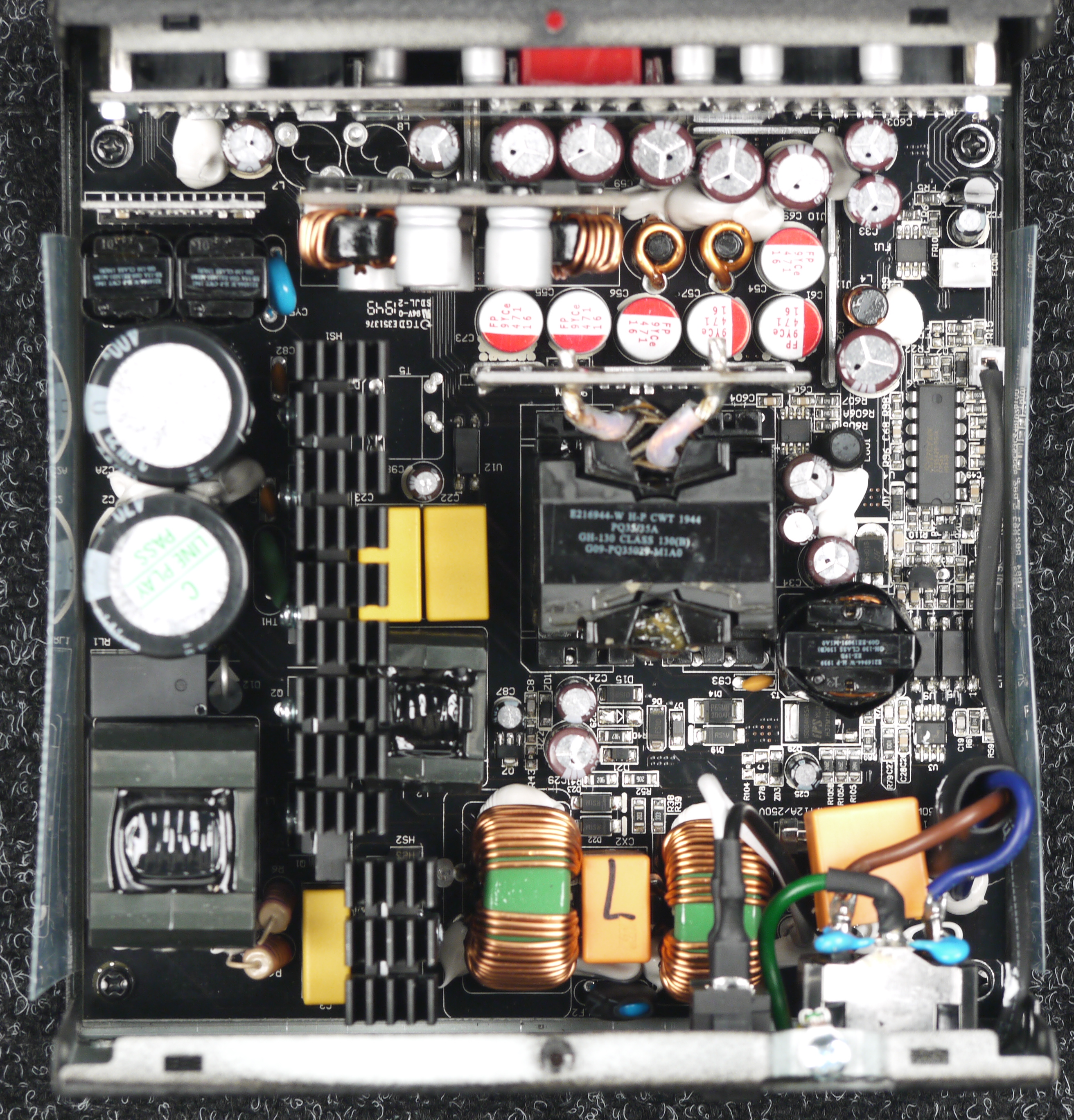 Конденсаторы в блоке питания имеют преимущественно японское происхождение. В основной массе это продукция под торговыми марками Nichicon и Nippon Chemi-Con. Установлено и большое количество полимерных конденсаторов.