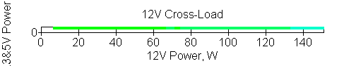 Следующим этапом инструментального тестирования является построение кросснагрузочной характеристики (КНХ) и представление ее на четвертьплоскости, ограниченной максимальной мощностью по шине 3,3&5 В с одной стороны (по оси ординат) и максимальной мощностью по шине 12 В с другой (по оси абсцисс). В каждой точке измеренное значение напряжения обозначается цветовым маркером в зависимости от отклонения от номинального значения.