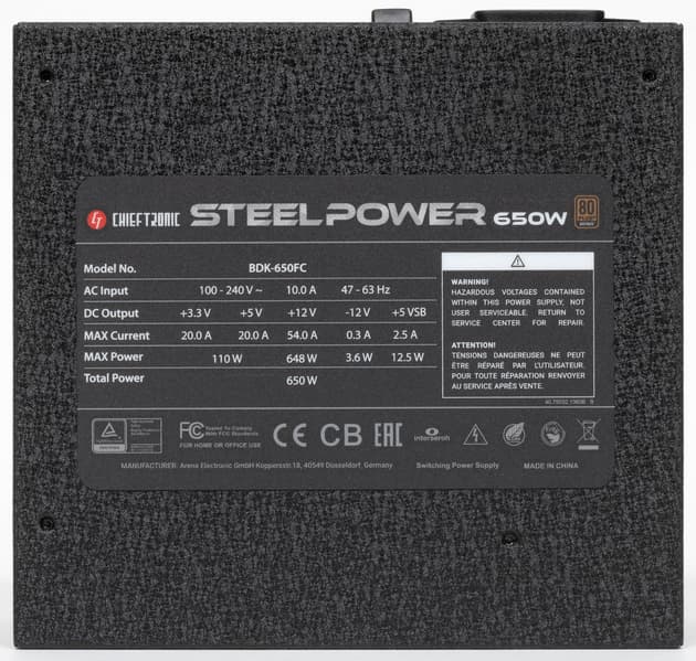 Потребительские качества Chieftronic Steel Power 650W (BDK-650FC) находятся на хорошем уровне. Нагрузочная способность канала +12VDC высокая, что позволяет использовать данный БП в достаточно мощных системах с одной производительной видеокартой.