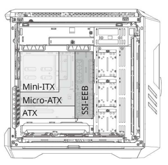Корпус представляет собой решение башенного типа с вертикально размещаемой платой формата ATX (и менее габаритной). Также заявлена поддержка плат E-ATX, причем плату можно установить полноразмерную, шириной до 330 мм (SSI EEB), или укороченную, шириной до 267 мм (SSI CEB).