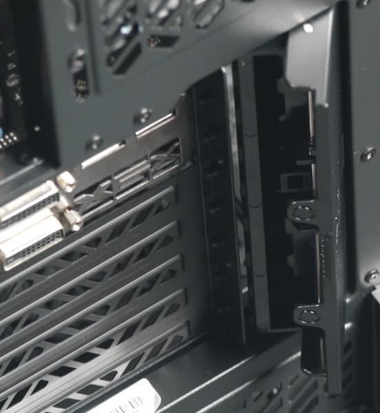 Система крепления карт расширения довольно интересная. По умолчанию используется безвинтовая система фиксации: платы расширения прижимаются П-образной поворотной деталью, которая выполнена из стали. Качество фиксации достигается высокое.
