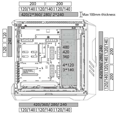 На основании для системной платы со стороны правой стенки также имеются места для установки элементов системы охлаждения шириной 120 или 140 мм и длиной до 480 мм, которые могут оказаться актуальными в случае использования в корпусе большого количества радиаторов.