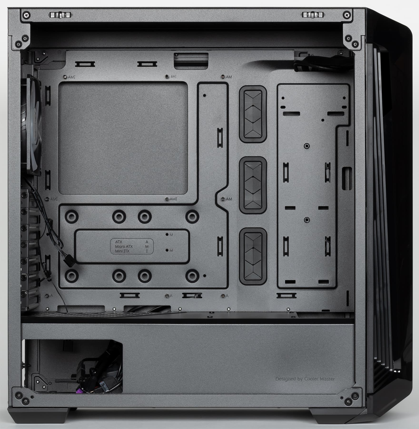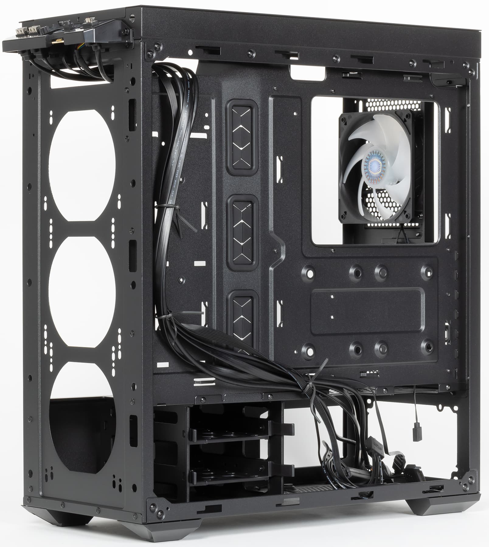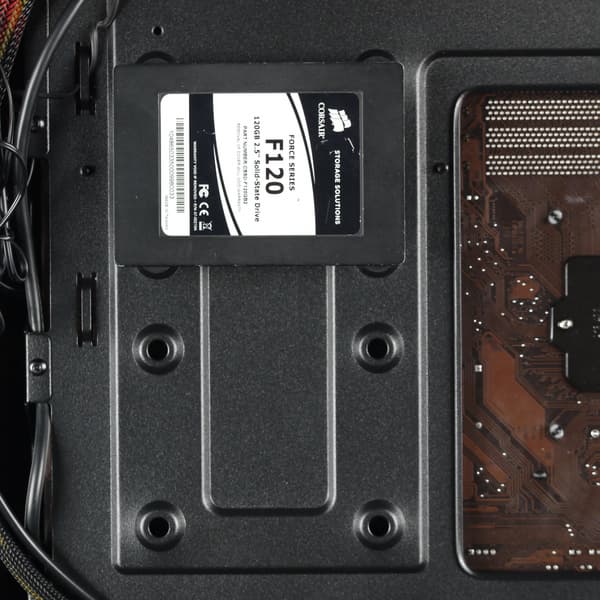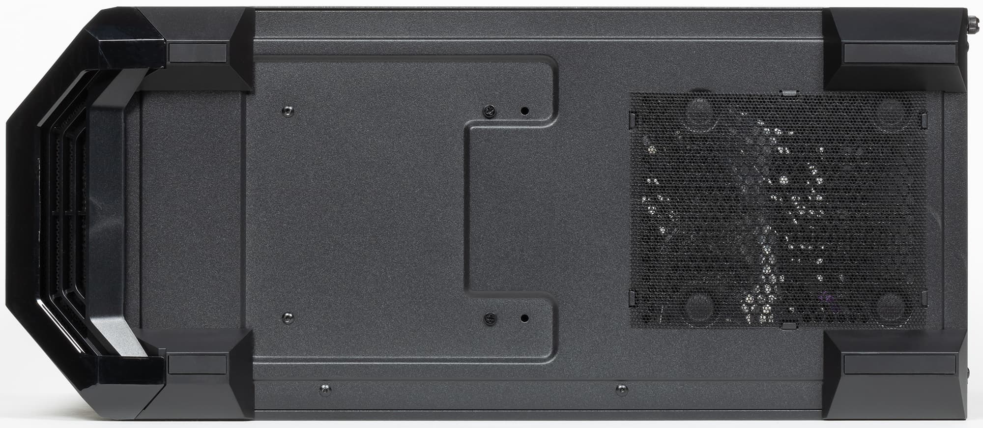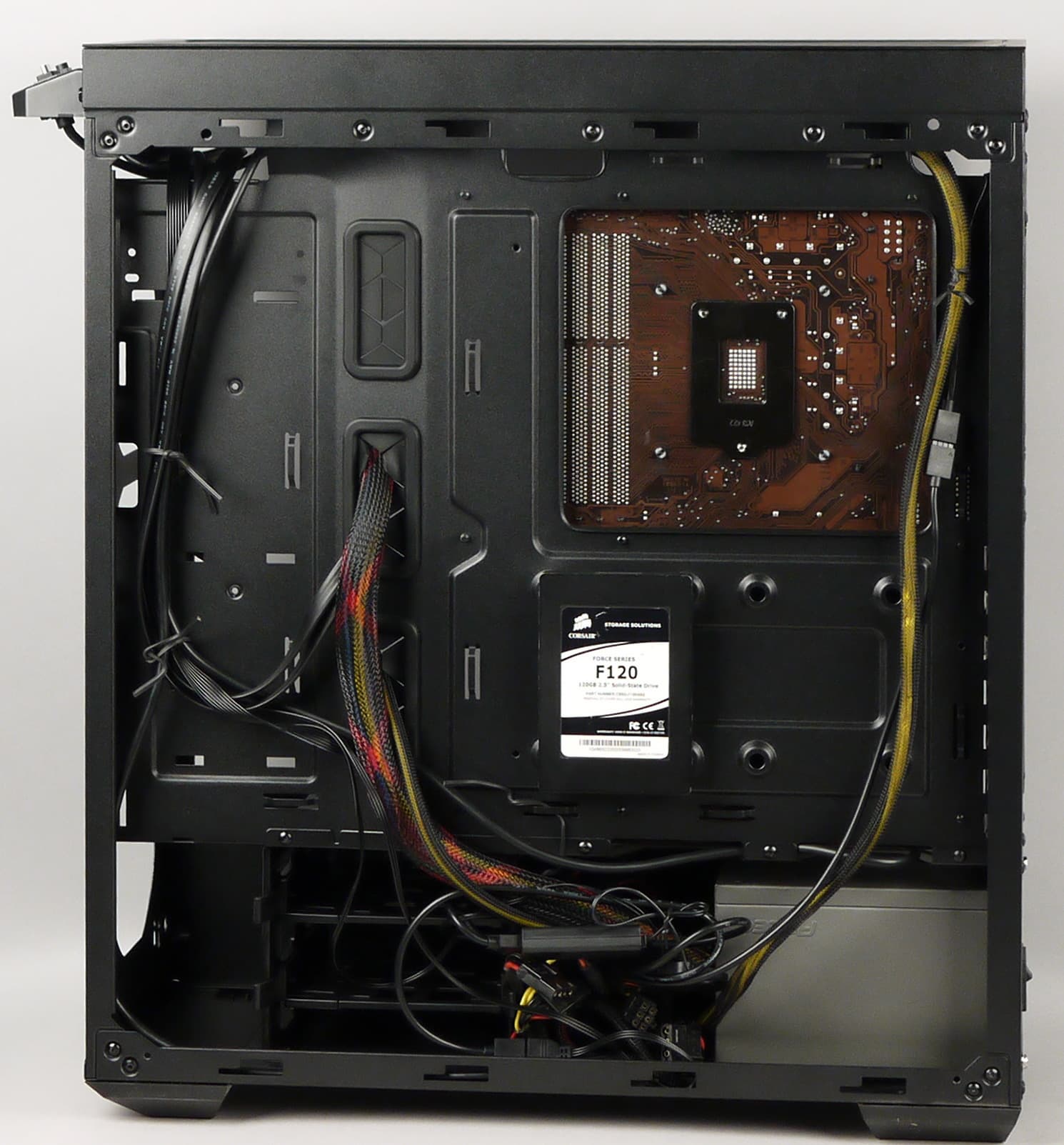 На оборотной стороне основания для системной платы также присутствуют места для установки накопителей. А вот посадочные места для накопителей с внешним доступом в корпусе полностью отсутствуют.