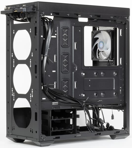 Компоновочные решения данной модели определяются современными тенденциями корпусостроения. В данном случае разработчики отказались от отсека для устройств формата 5,25″, а привычный отсек для устройств 3,5″ расположен около передней стенки шасси, но присутствует он в усеченном виде, всего на два диска, и снять его нельзя.