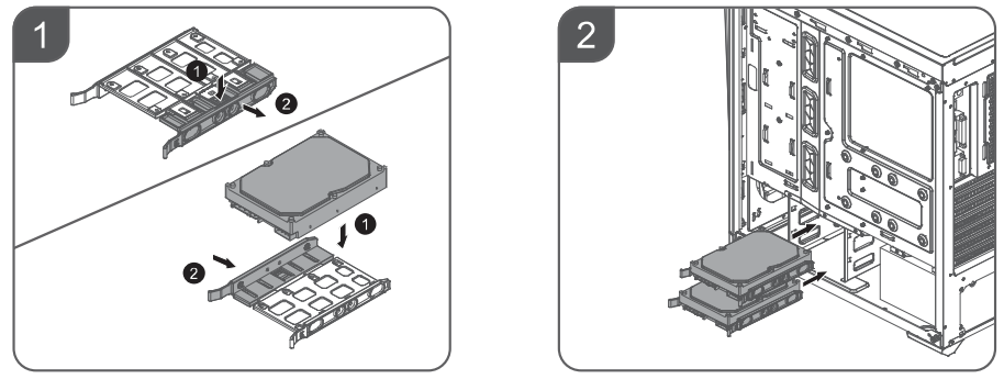 Всего можно установить 4 накопителя формата 2,5 дюйма или 2×3,5″ и 2×2,5″. Этого вполне достаточно для типичного домашнего или офисно-рабочего компьютера, хотя для серьезной рабочей станции может оказаться мало (но вряд ли серьезную рабочую станцию будут собирать в таком корпусе).