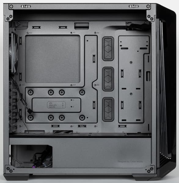 Cooler Master MasterBox 540 интересен в первую очередь благодаря оригинальному дизайну передней панели, особенно с работающей подсветкой, хотя и с выключенной подсветкой он выглядит довольно симпатично. Собирать и модернизировать систему в корпусе достаточно удобно благодаря быстросъемной левой панели, правая панель в этом плане заметно менее удобна. Также стоит отметить возможность снять верхнюю панель — кому-то это будет актуально. Внутренний объем вполне позволяет использовать современные высокопроизводительные компоненты.