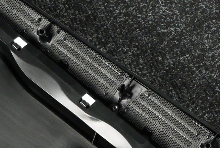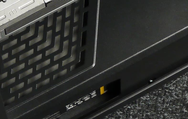 Фильтр под блоком питания выполнен из крупноячеистой сетки, которая представляет собой проштампованный лист пластика с круглыми отверстиями. Рамки он не имеет. И если снять его на ощупь еще как-то можно, то поставить обратно уже затруднительно. К тому же, зацепы для фильтра очень короткие, что приводит к периодическому выпадению фильтрующего элемента, особенно если двигать корпус по ковровому покрытию.