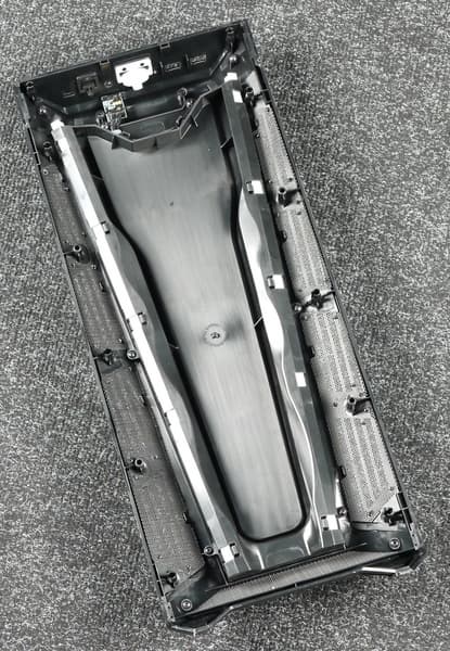 Несущая часть передней панели выполнена из пластика, который окрашен в массе. Крепление стандартное — на распорных элементах. Лицевая часть передней панели выполнена из тонированного полупрозрачного пластика с зеркальной поверхностью, под ней расположена светодиодная лента. Подключается светодиодная лента через быстроразъемную контактную группу, вручную ничего присоединять не нужно, что удобно. Неудобно, что помыть целиком переднюю панель в таком исполнении нельзя, а о том, что мыть ее придется регулярно, говорит использованный для ее создания материал: прозрачный пластик отлично собирает на себя пыль и отпечатки пальцев как внутри, так и снаружи.