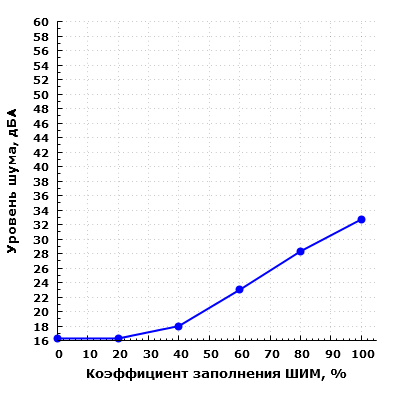 Мы провели измерения уровня шума системы охлаждения корпуса при изменении коэффициента заполнения ШИМ от 0 до 100% с шагом 20%.