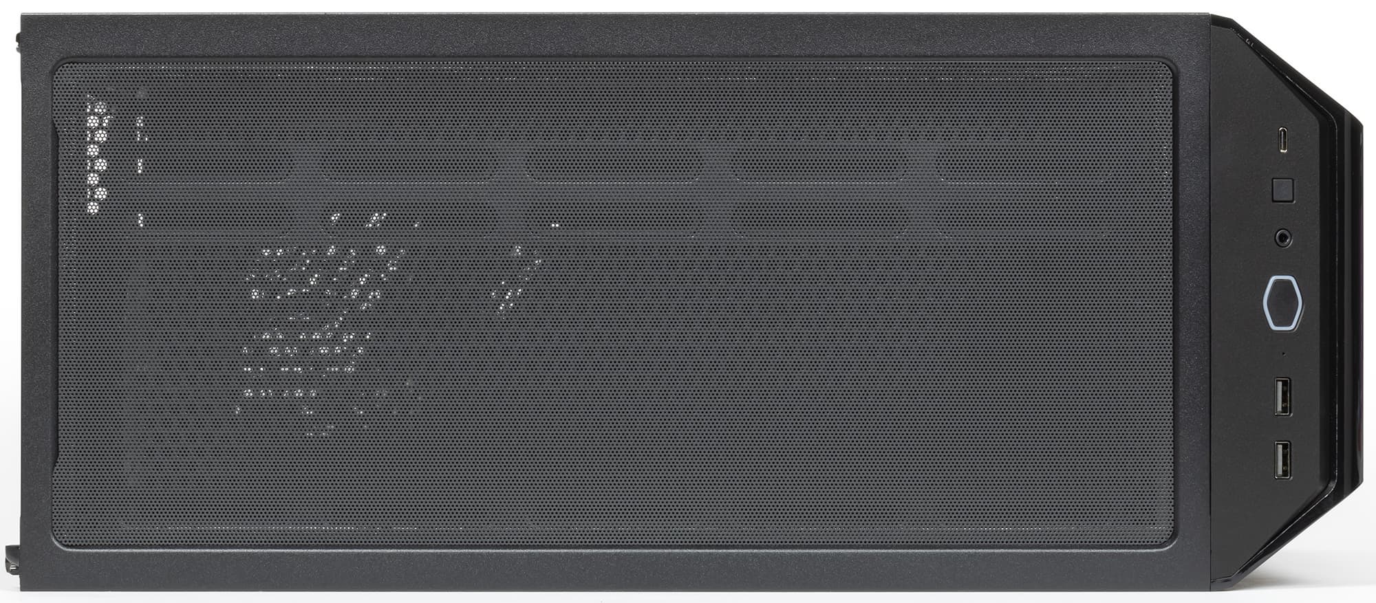 Передняя панель переходит в верхнюю через скошенную площадку (конструкционно это верхняя панель), на которой размещены кнопки и интерфейсные разъемы: два порта USB 3.0, один порт USB3 Gen 2 (USB 3.1) Type-C, комбинированный разъем для подключения микрофона и наушников или гарнитуры. Таким образом, корпус позволяет подключать проводные гарнитуры как с цифровым, так и с аналоговым интерфейсом со стороны передней панели. Но разъемов USB все-таки хотелось бы видеть чуть больше, двух разъемов (типа A) не всегда достаточно для оперативного подключения периферийного оборудования.