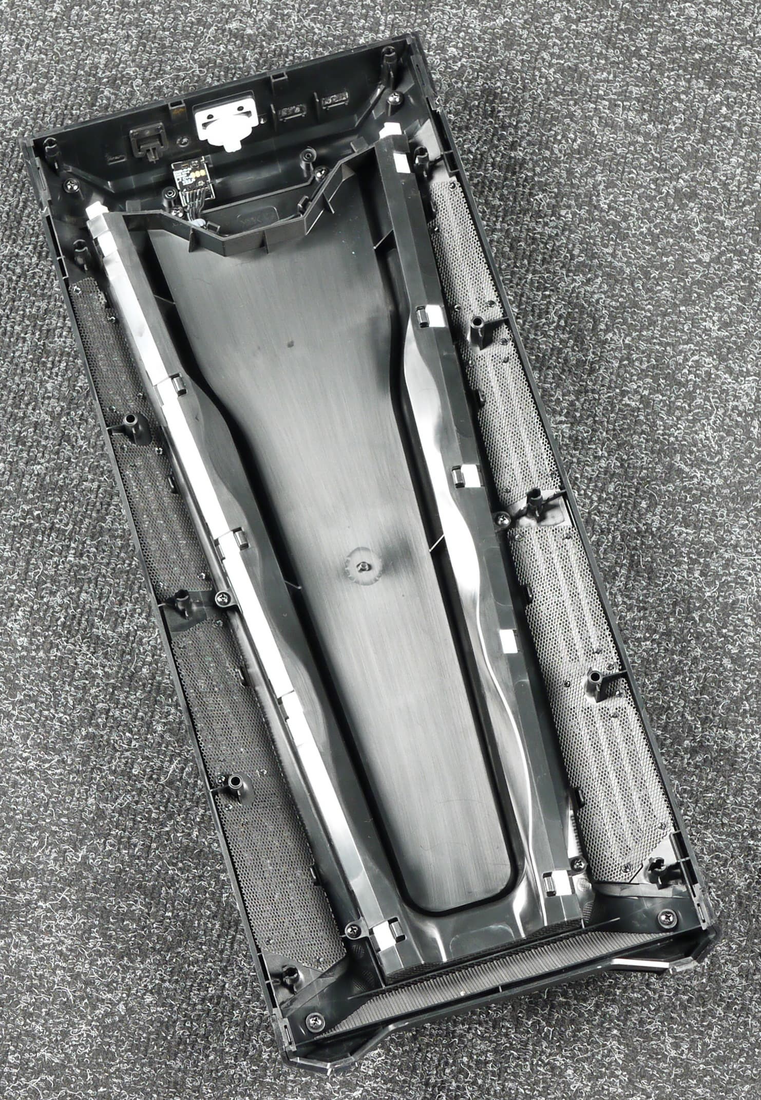 Снять только фильтрующие элементы в данном случае нельзя, а промыть под водой переднюю панель целиком не представляется возможным, так как на ней смонтированы электрические цепи питания и светодиодная лента.