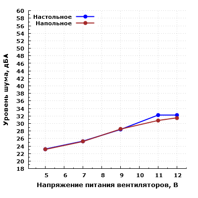 При большем удалении корпуса от пользователя и размещении его, к примеру, на полу под столом шум можно будет охарактеризовать как минимально заметный при питании вентилятора от 5 В, а при питании от 12 В — как пониженный для жилого помещения в дневное время суток.