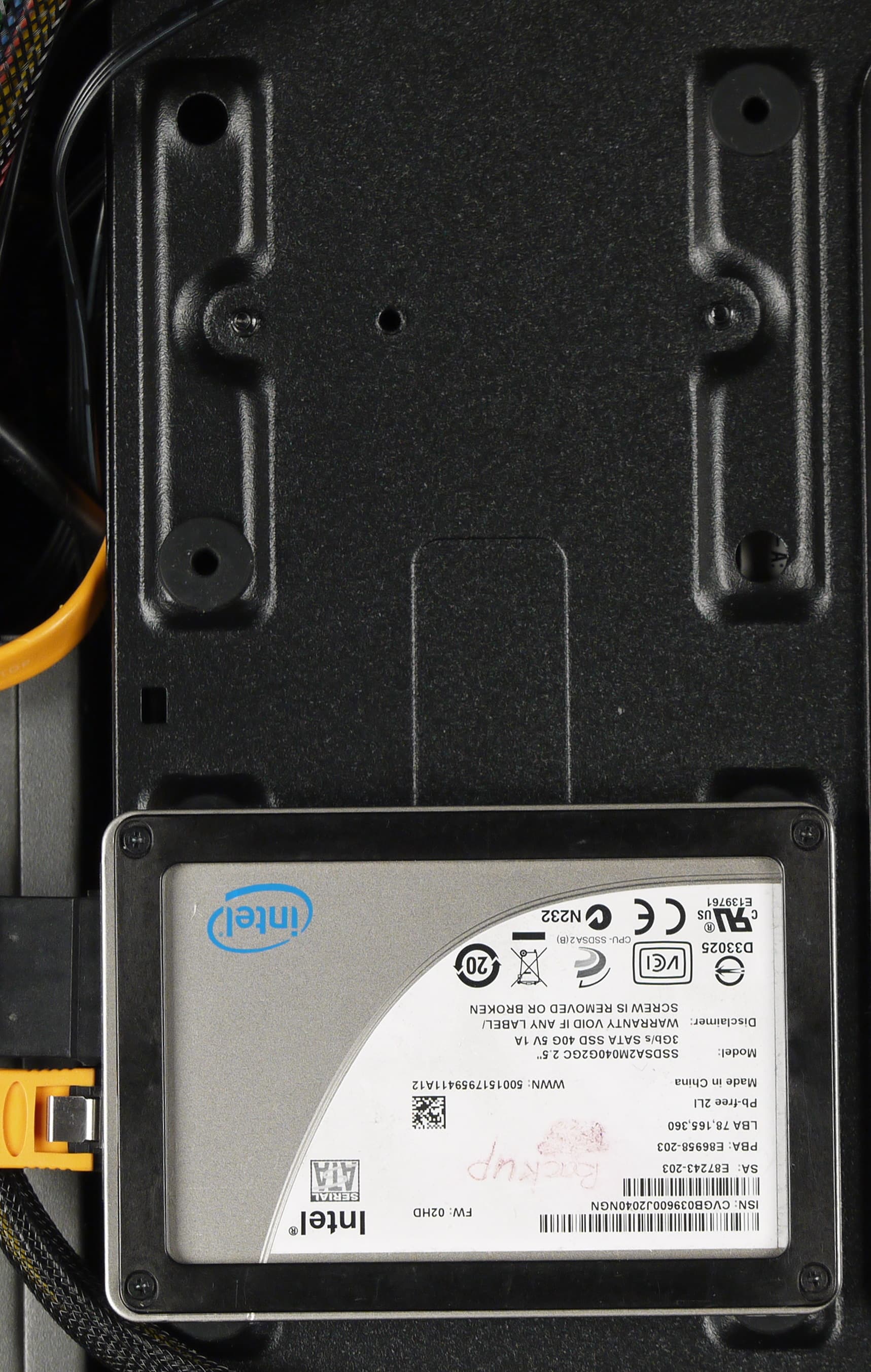 Полноразмерные жесткие диски устанавливаются в предназначенную для них двухместную корзину. Фиксируется корзина при помощи одного винта и зацепов с противоположной стороны. Корзина съемная.