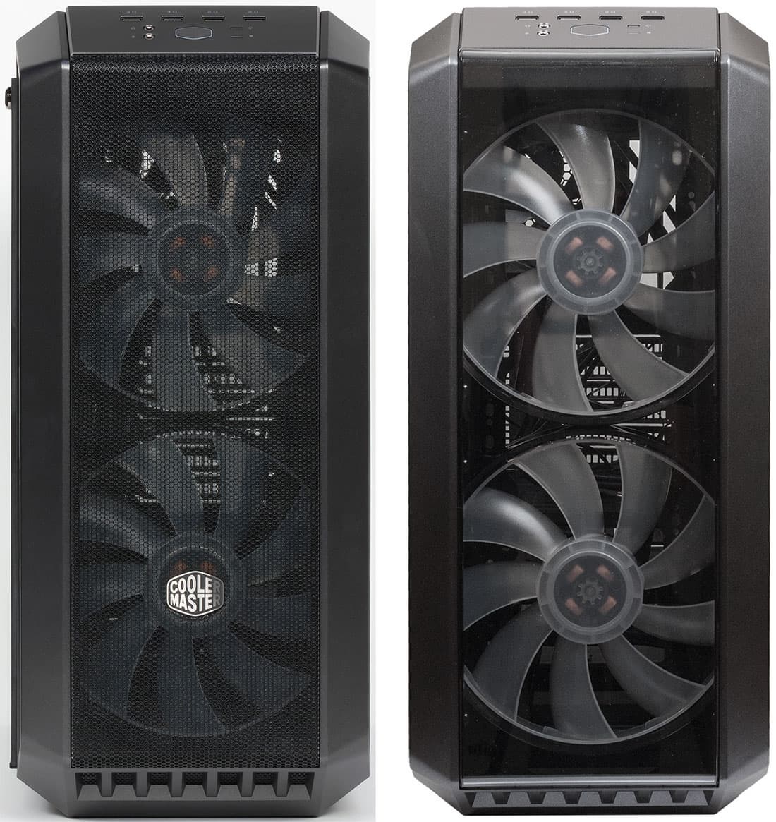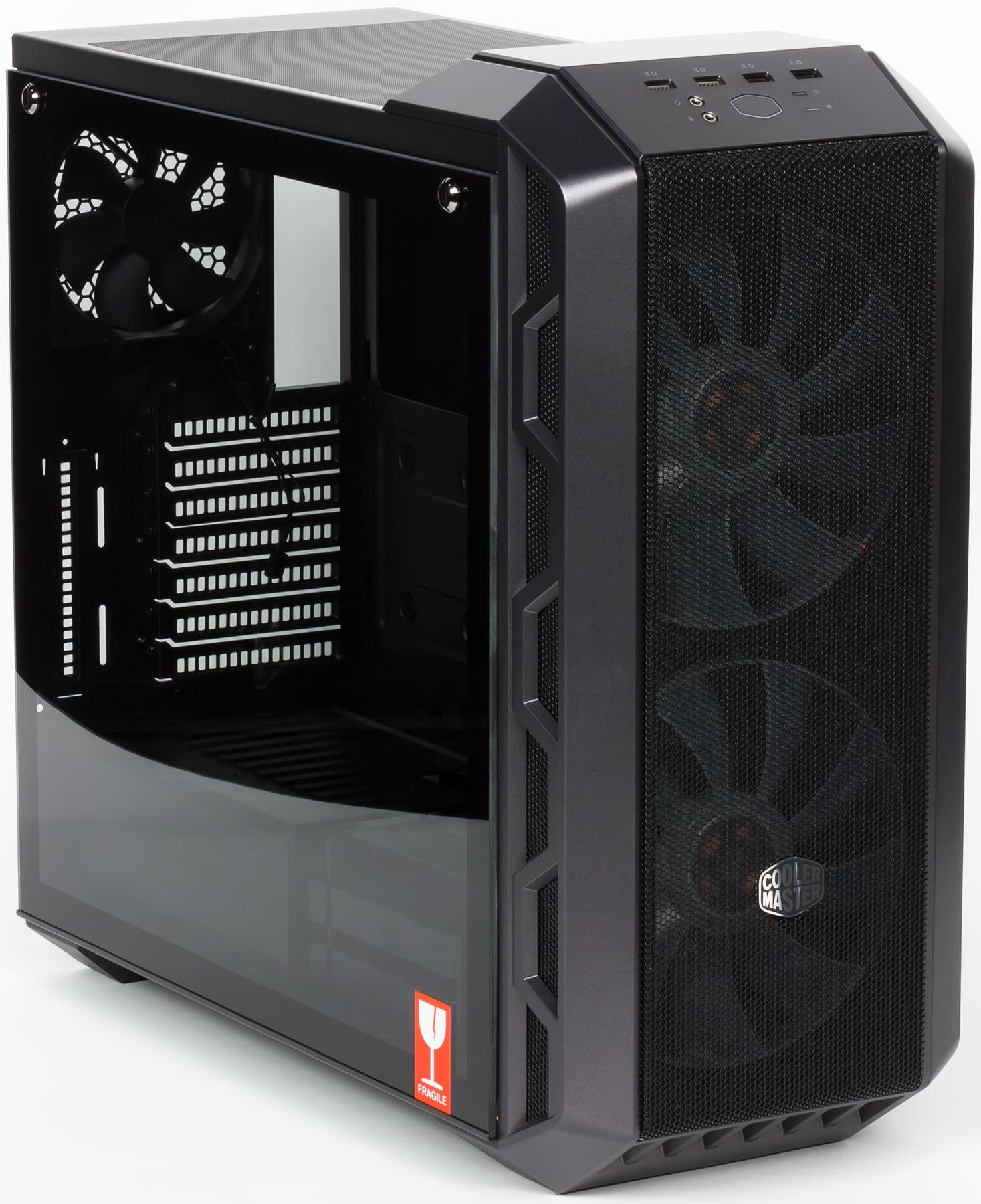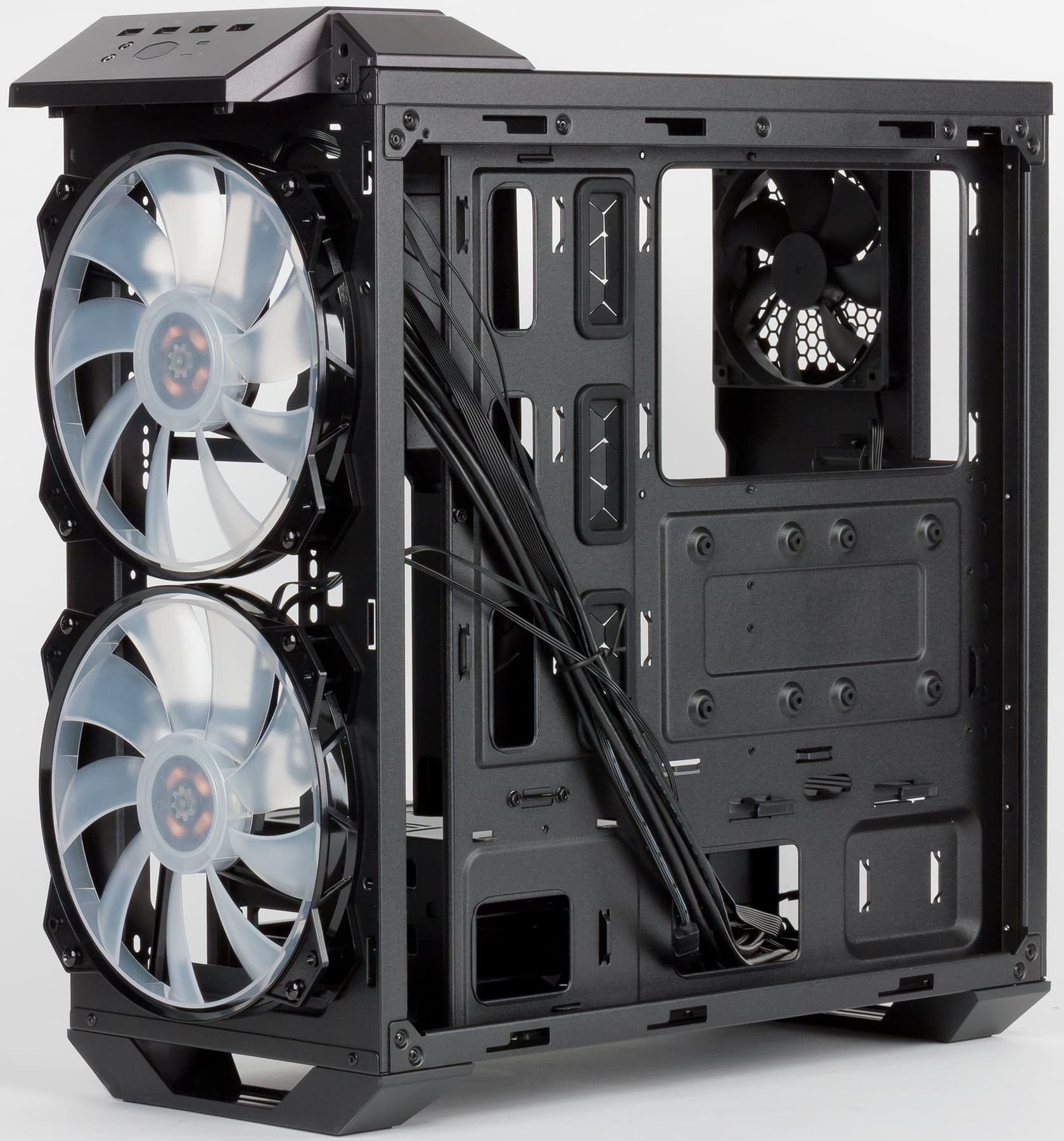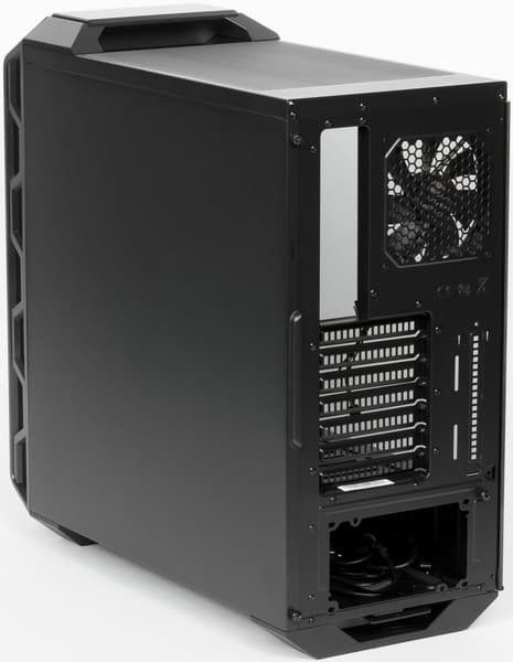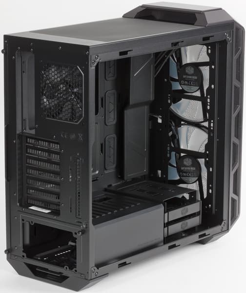 Корпус MasterCase H500 укомплектован тремя вентиляторами. Задний вытяжной, размерность 120 мм, без подсветки, оснащен стандартным 3-контактным коннектором.