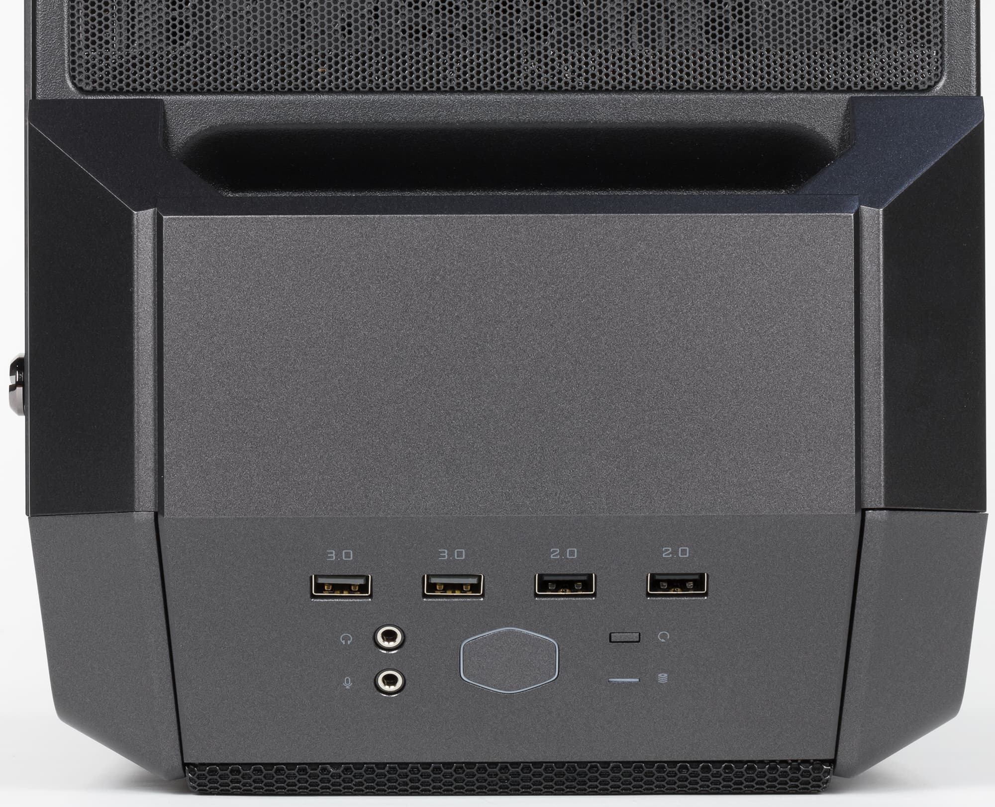 Содержимое панели управления расположено в два ряда, в верхнем находятся порты — по два USB 2.0 и USB 3.0 (без цветовой маркировки, но с цифровыми обозначениями сверху). Разъемы ориентированы в одну линию, а зазор между ними составляет 11 мм, поэтому возможны проблемы при одновременном подключении широких устройств в соседние порты.